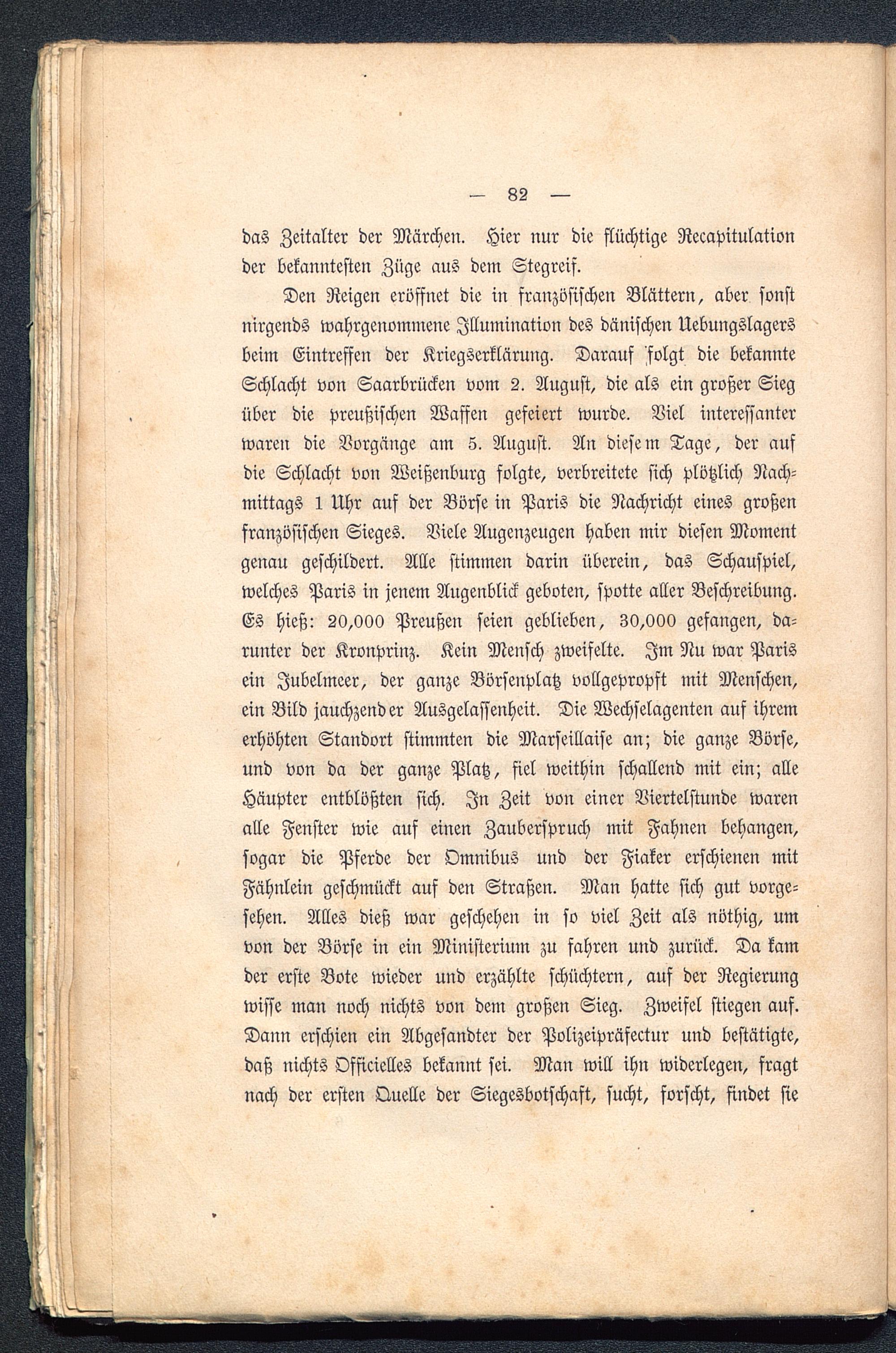 Den Reigen eröffnet die in französischen Blättern, aber sonstnirgends wahrgenommene Illumination des dänischen Uebungslagersbeim Eintreffen der Kriegserklärung. Darauf ^folgt die bekannteSchlacht von Saarbrücken vom 2. August, die als ein großer Siegüber die preußischen Waffen gefeiert wurde. Viel interessanterwaren die Vorgänge am 5. August. An diesem Tage, der aufdie Schlacht von Weißenburg folgte, verbreitete sich plötzlich Nach-mittags 1 Uhr auf der Börse in Paris die Nachricht eines großenfranzösischen Sieges. Viele Augenzeugen haben mir diesen Momentgenau geschildert. Alle stimmen darin überein, das Schauspiel,welches Paris in jenem Augenblick geboten, spotte aller Beschreibung.Es hieß: 20,000 Preußen seien geblieben, 30,000 gefangen, da-runter der Kronprinz. Kein Mensch zweifelte. Im Nu war Paris ein Jubelmeer, der ganze Börsenplatz vollgepropft mit Menschen,ein Bild jauchzender Ausgelassenheit. Die Wechselagenten auf ihremerhöhten Standort stimmten die Marseillaise an; die ganze Börse,und von da der ganze Platz, fiel weithin schallend mit ein; alleHäupter entblößten sich. In Zeit von einer Viertelstunde warenalle Fenster wie auf einen Zauberspruch mit Fahnen behängen,sogar die Pferde der Omnibus und der Fiaker erschienen mitFähnlein geschmückt auf den Straßen. Man hatte sich gut vorge-sehen. Alles dieß war geschehen in so viel Zeit als nöthig, umvon der Börse in ein Ministerium zu fahren und zurück. Da kamder erste Bote wieder und erzählte schüchtern, auf der Regierungwisse man noch nichts von dem großen Sieg. Zweifel stiegen auf.Dann erschien ein Abgesandter der Polizeipräfectur und bestätigte,daß nichts Offtcielles bekannt sei. Man will ihn widerlegen, fragtnach der ersten Quelle der Siegesbotschaft, sucht, forscht, findet sie