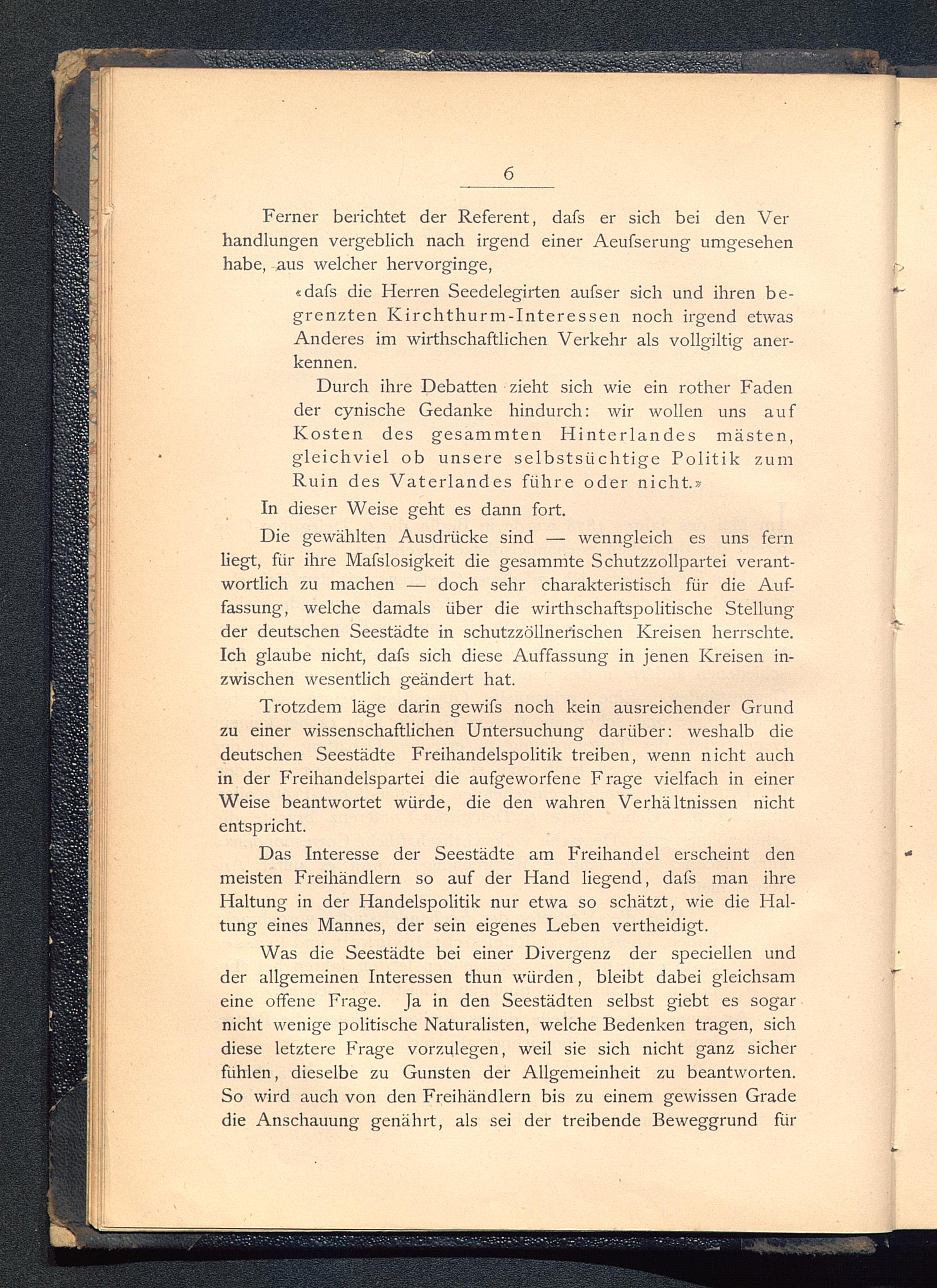 Das Interesse der Seestädte am Freihandel erscheint denmeisten Freihändlern so auf der Hand liegend, dafs man ihreHaltung in der Handelspolitik nur etwa so schätzt, wie die Hal-tung eines Mannes, der sein eigenes Leben vertheidigt.