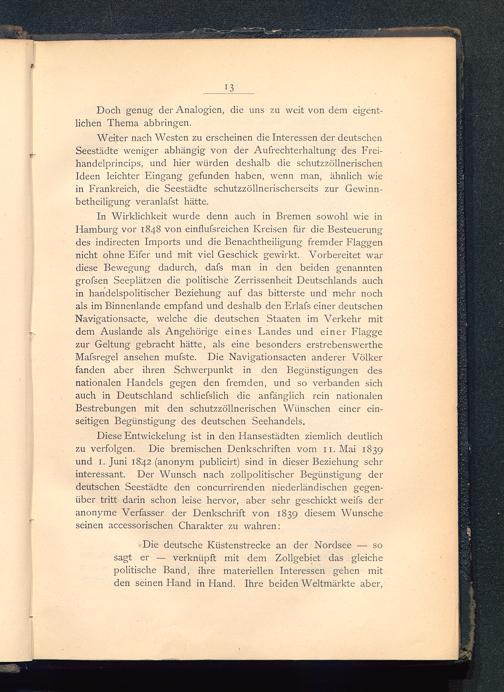 «Die deutsche Küstenstrecke an der Nordsee — sosagt er — verknüpft mit dem Zollgebiet das gleichepolitische Band, ihre materiellen Interessen gehen mitden seinen Hand in Hand. Ihre beiden Weltmärkte aber,