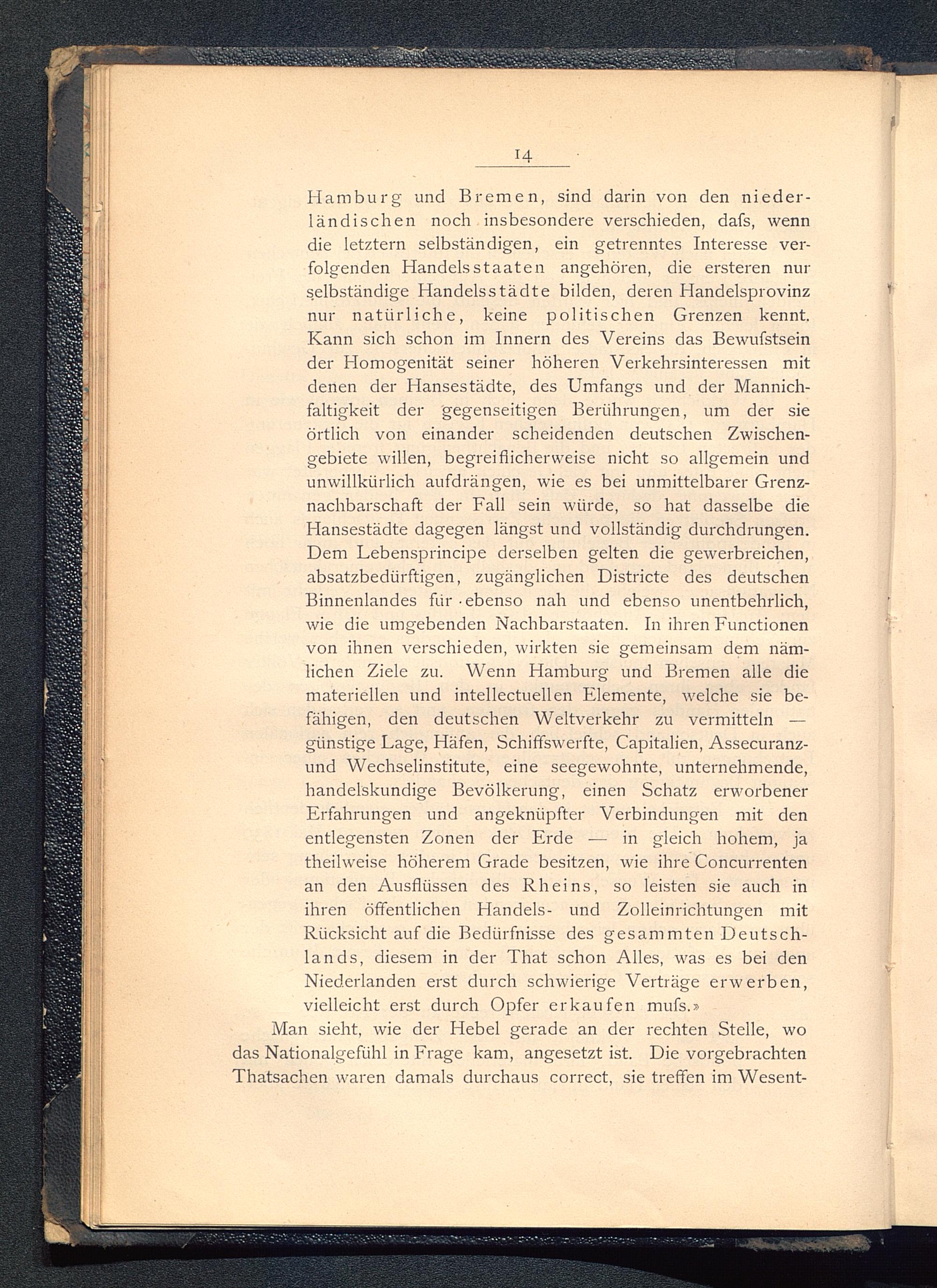 Hamburg und Bremen , sind darin von den nieder-ländischen noch insbesondere verschieden, dafs, wenndie letztem selbständigen, ein getrenntes Interesse ver-folgenden Handels Staaten angehören, die ersteren nurselbständige Handelsstädte bilden, deren Handelsprovinznur natürliche, keine politischen Grenzen kennt.Kann sich schon im Innern des Vereins das Bewufstseinder Homogenität seiner höheren Verkehrsinteressen mitdenen der Hansestädte, des Umfangs und der Mannich-faltigkeit der gegenseitigen Berührungen, um der sieörtlich von einander scheidenden deutschen Zwischen-gebiete willen, begreiflicherweise nicht so allgemein undunwillkürlich aufdrängen, wie es bei unmittelbarer Grenz-nachbarschaft der Fall sein würde, so hat dasselbe dieHansestädte dagegen längst und vollständig durchdrungen.Dem Lebensprincipe derselben gelten die gewerbreichen,absatzbedürftigen, zugänglichen Districte des deutschenBinnenlandes für - ebenso nah und ebenso unentbehrlich,wie die umgebenden Nachbarstaaten. In ihren Functionenvon ihnen verschieden, wirkten sie gemeinsam dem näm-lichen Ziele zu. Wenn Hamburg und Bremen alle diemateriellen und intellectuellen Elemente, welche sie be-fähigen, den deutschen Weltverkehr zu vermitteln —günstige Lage, Häfen, Schiffswerfte, Capitalien, Assecuranz-und Wechselinstitute, eine seegewohnte, unternehmende,handelskundige Bevölkerung, einen Schatz erworbenerErfahrungen und angeknüpfter Verbindungen mit denentlegensten Zonen der Erde — in gleich hohem, jatheilweise höherem Grade besitzen, wie ihre Concurrentenan den Ausflüssen des Rheins, so leisten sie auch inihren öffentlichen Handels- und Zolleinrichtungen mitRücksicht auf die Bedürfnisse des gesammten Deutsch-lands , diesem in der That schon Alles, was es bei denNiederlanden erst durch schwierige Verträge erwerben,vielleicht erst durch Opfer erkaufen mufs.»