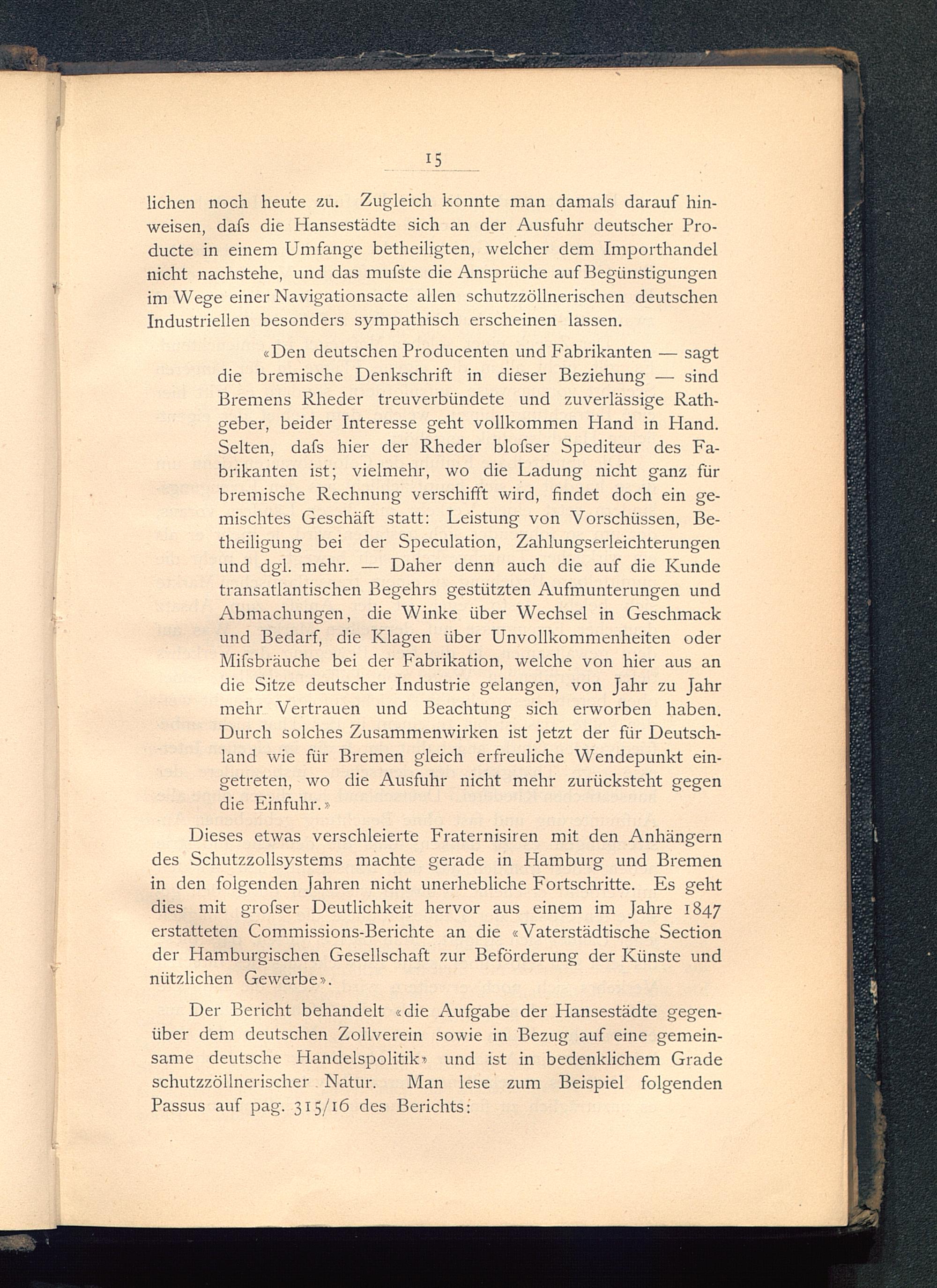 Der Bericht behandelt «die Aufgabe der Hansestädte gegen-über dem deutschen Zollverein sowie in Bezug auf eine gemein-same deutsche Handelspolitik» und ist in bedenklichem Gradeschutzzöllnerischer Natur. Man lese zum Beispiel folgendenPassus auf pag. 315/16 des Berichts: