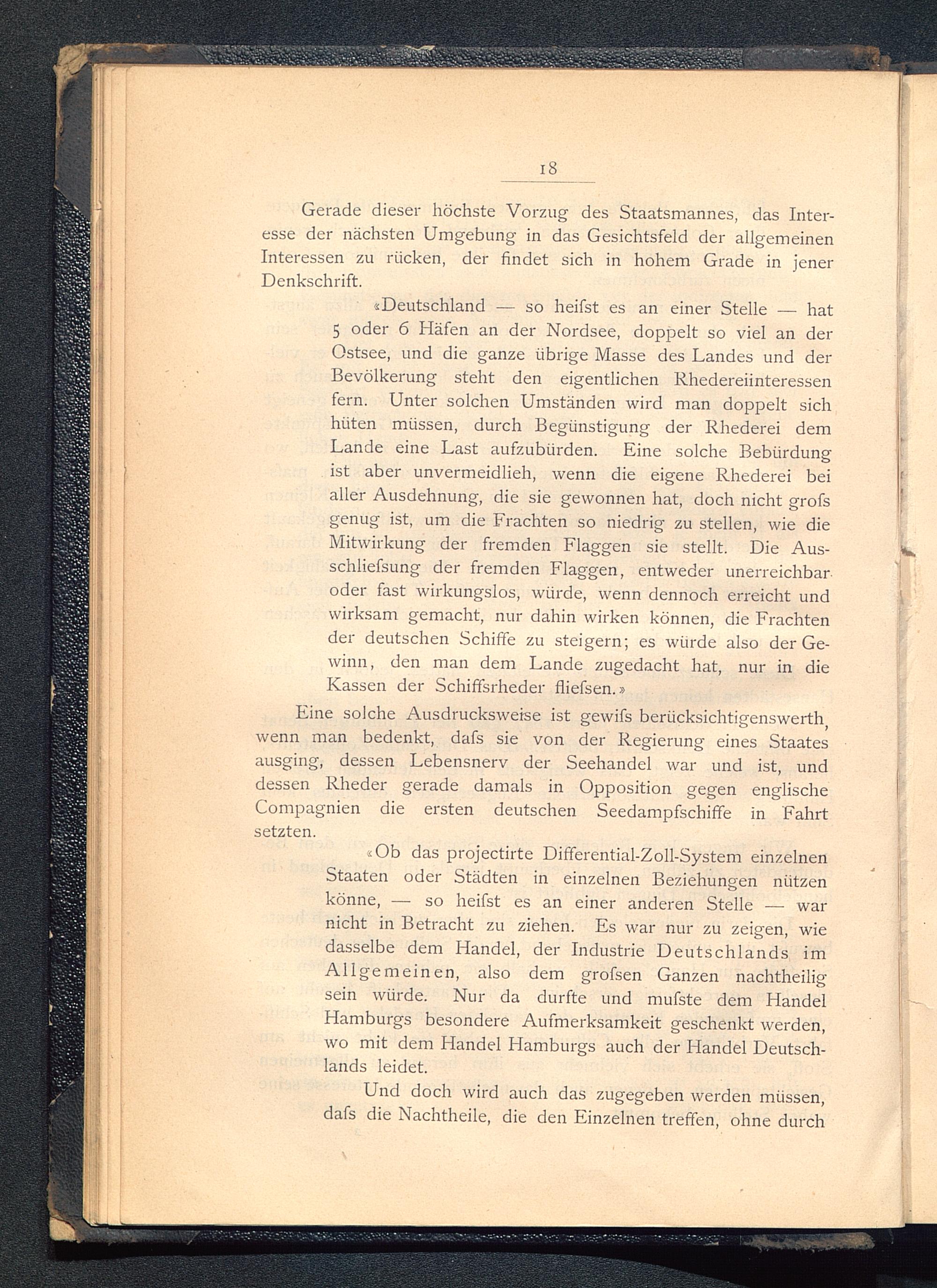 «Ob das projectirte Differential-Zoll-System einzelnenStaaten oder Städten in einzelnen Beziehungen nützenkönne, — so heifst es an einer anderen Stelle — warnicht in Betracht zu ziehen. Es war nur zu zeigen, wiedasselbe dem Handel, der Industrie Deutschlands imAllgemeinen, also dem grofsen Ganzen nachtheiligsein würde. Nur da durfte und mufste dem HandelHamburgs besondere Aufmerksamkeit geschenkt werden,wo mit dem Handel Hamburgs auch der Handel Deutsch-lands leidet.