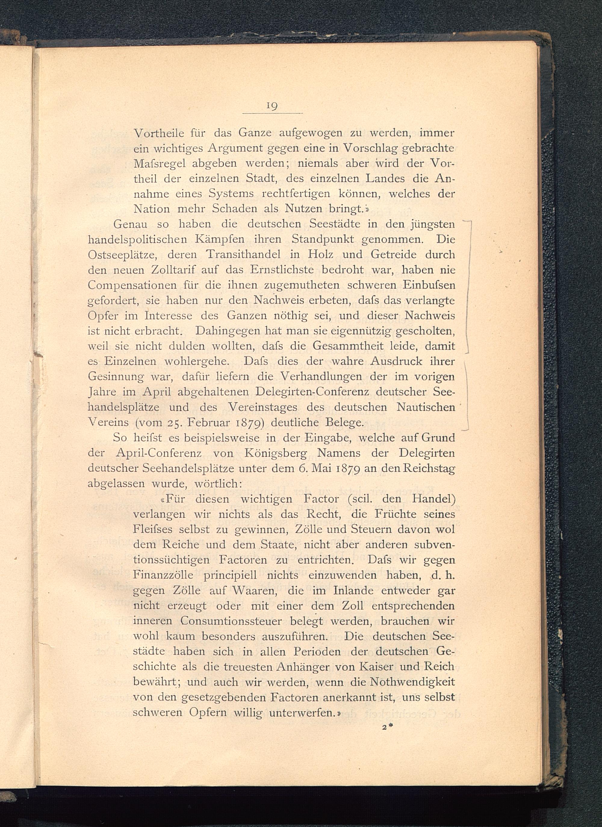 So heifst es beispielsweise in der Eingabe, welche auf Grundder April-Conferenz von Königsberg Namens der Delegirtendeutscher Seehandelsplätze unter dem 6. Mai 1879 an den Reichstag abgelassen wurde, wörtlich: