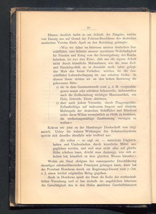 «Was wir daher im Interesse unserer deutschen See-schifffahrt, zum Schutze unserer maritimen Wehrhaftigkeitfür Frieden und Krieg von der Gesetzgebung des Reichsheischen, ist nur das Eine, dafs uns die eigene Arbeitnicht durch künstliche Mafsnahmen, wie die neue Zoll-und Handelspolitik sie in Aussicht stellt, lahm gelegt,das Mafs des freien Verkehrs, welches für die See-schifffahrt Lebensbedingung ist, uns erhalten bleibe. Indiesem Sinne richten wir an den hohen Reichstag diegehorsame Bitte: