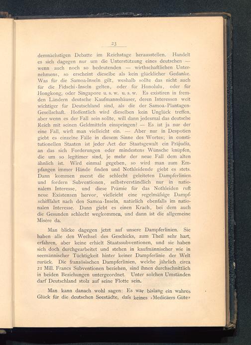 demnächstigen Debatte im Reichstage herausstellen. Handeltes sich dagegen nur um die Unterstützung eines deutschen —wenn auch noch so bedeutenden — wirtschaftlichen Unter-nehmens, so erscheint dieselbe als kein glücklicher Gedanke.Was für die Samoa-Inseln gilt, weshalb sollte das nicht auchfür die Fidschi-Inseln gelten, oder für Honolulu , oder fürHongkong , oder Singapore u. s. w. u. s. w. Es existiren in frem-den Ländern deutsche Kaufmannshäuser, deren Interessen weitwichtiger für Deutschland sind, als die der Samoa-Plantagen-Gesellschaft. Hoffentlich wird dieselben kein. Unglück treffen,aber wenn es der Fall sein sollte, will dann jedesmal das deutscheReich mit seinen Geldmitteln einspringen? — Es ist ja nur dereine Fall, wirft man vielleicht ein. — Aber nur in Despotiengiebt es einzelne Fälle in diesem Sinne des Wortes; in consti-tutioneilen Staaten ist jeder Act der Staatsgewalt ein Präjudiz,an das sich Forderungen oder mindestens Wünsche knüpfen,die um so legitimer sind, je mehr der neue Fall dem altenähnlich ist. Wird einmal gegeben, so wird man zum Em-pfangen immer Hände finden und Nothleidende giebt es stets.Dann kommen zuerst die schlecht geleiteten Dampferlinienund fordern Subventionen, selbstverständlich nur in natio-nalem Interesse, und diese Prämie für das Nothleiden ruftneue Existenzen hervor, vielleicht eine regelmäfsige Dampf-schifffahrt nach den Samoa-Inseln , natürlich ebenfalls im natio-nalen Interesse. Dann giebt es einen Krach, bei dem auchdie Gesunden schlecht wegkommen, und dann ist die allgemeineMisere da.