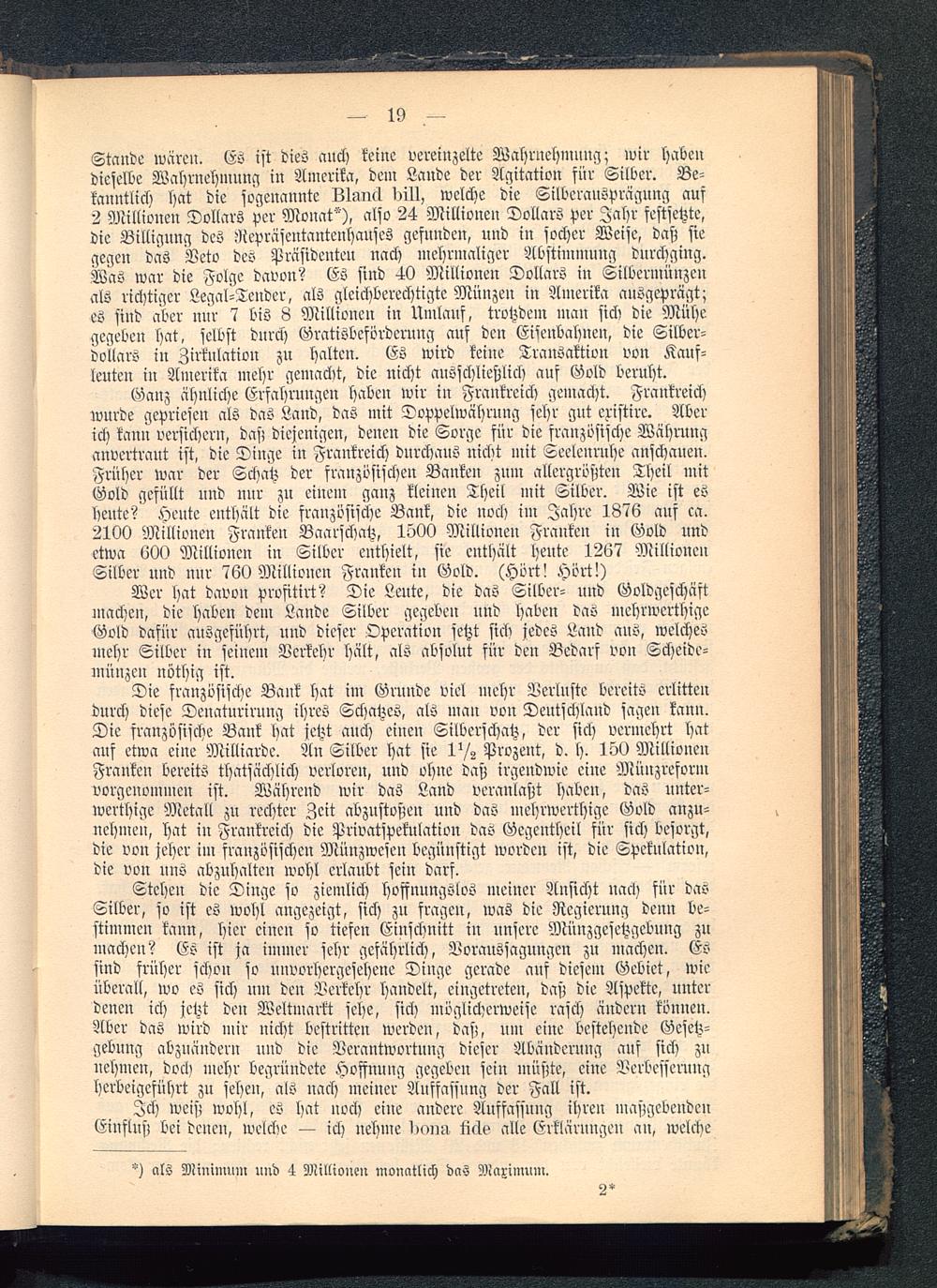 Ganz ähnliche Erfahrungeu haben wir in Frankreich gemacht. Frankreich wurde gepriesen als das Land, das mit Doppelwährung sehr gut eristire. Aberich kanu versichern, daß diejenigen, denen die Sorge für die französische Währunganvertraut ist, die Dinge in Frankreich durchaus nicht mit Seelenruhe anschauen.Früher war der Schatz der französischen Banken zum allergrößten Theil mitGold gefüllt und nur zu einem ganz kleinen Theil mit Silber. Wie ist esheute? ^eute enthält die französische Bank, die noch im Jahre 1876 auf ca.2100 Millionen Franken Baarschatz, 1500 Millionen Franken in Gold undetwa 000 Millionen in Silber enthielt, sie enthält heute 1267 MillioueuSilber und nur 760 Millionen Franken in Gold. (Hört! Hört!)