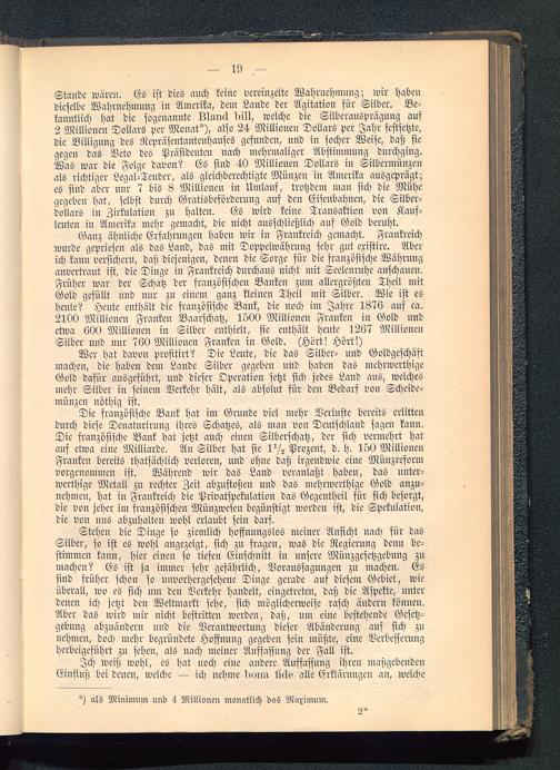 Stande wären. ES ist dies auch keine vereinzelte Wahrnehmung; wir habendieselbe Wahrnehmung in Amerika , dein Lande der Agitation sür Silber. Be-kanntlich hat die sogenannte Lluiul MI, welche die Silberausprägung aus2 Millionen Dollars per Monat"), also 24 Millionen Dollars per Jahr festsetzte,die Billigung des Repräsentantenhauses gefunden, und in socher Weise, daß siegegen das Veto des Präsidenten nach mehrmaliger Abstimmung durchging.Was war die Folge davon? Es sind 40 Millionen Dollars in Silbermünzcnals richtiger Legal-Tender, als gleichberechtigte Münzen in Amerika ausgeprägt;es siud aber nur 7 bis 8 Millionen in Umlauf, trotzdem man sich die Mühegegeben hat, selbst durch Gratisbefördcrung auf den Eisenbahnen, die Silber-dollars in Zirkulation zu halten. ES wird keine Transaktion von Kauf-leuten iu Amerika mehr gemacht, die nicht ausschließlich auf Gold beruht.