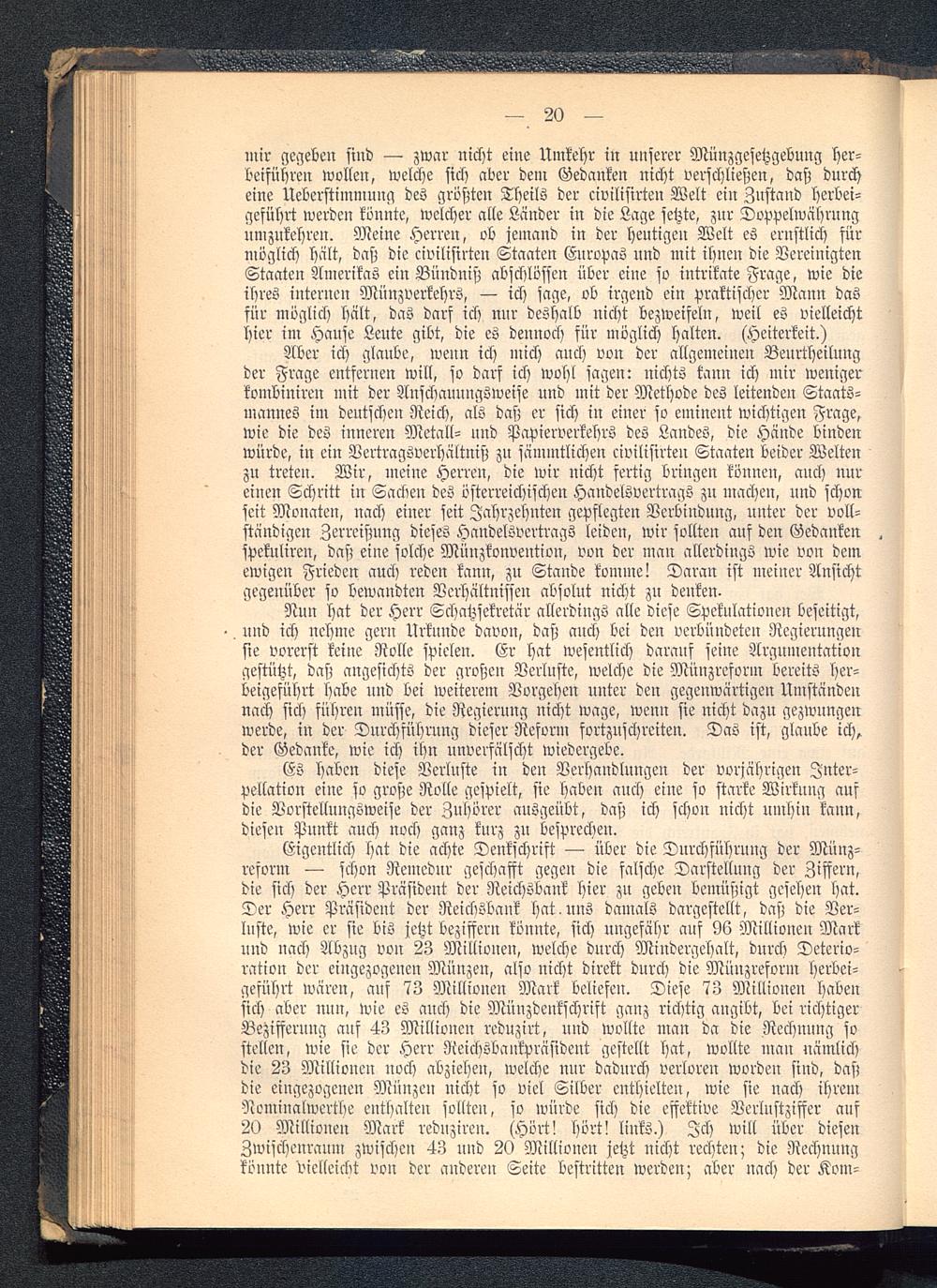 Eigentlich hat die achte Denkschrift — über die Durchführung der Münz-rcform — schon Remednr geschafft gegen die falsche Darstellung der Ziffern,die sich der Herr Präsident der Neichsbank hier zn geben bemüßigt gesehen hat.Der Herr Präsident der ReicbSbank hat, uns damals dargestellt, daß die Ver-luste, wie er sie bis jetzt beziffern könnte, sich ungefähr auf 96 Millionen Marknnd nach Abzug von 23 Millionen, welche durch Mindergehalt, durch Deterio-ration der eingezogenen Münzen, also nicht direkt durch die Münzreform herbei-geführt wären, ans 73 Millionen Mark beliefen. Diese 73 Millionen habensich aber nun, wie es anch die Münzdenkschrift ganz richtig angibt, bei richtigerBezifferung auf 43 Millionen reduzirt, nnd wollte man da die Rechnung sostellen, wie sie der Herr Reichsbaukpräsident gestellt hat, wollte man nämlichdie 23 Millionen noch abziehen, welche nnr dadurch verloren worden sind, daßdie eingezogenen Münzen nicht so viel Silber enthielten, wie sie nach ihremNominalwerthe enthalten sollten, so wurde sich die effektive Verlustziffer auf20 Millionen Mark rednzireu. (Hört! hört! links.) Ich will über diesenZwischenraum zwischen 43 und 20 Millionen jetzt nicht rechten; die Rechnungkönnte vielleickit von der anderen Seite bestritten werden; aber nach der Kom-