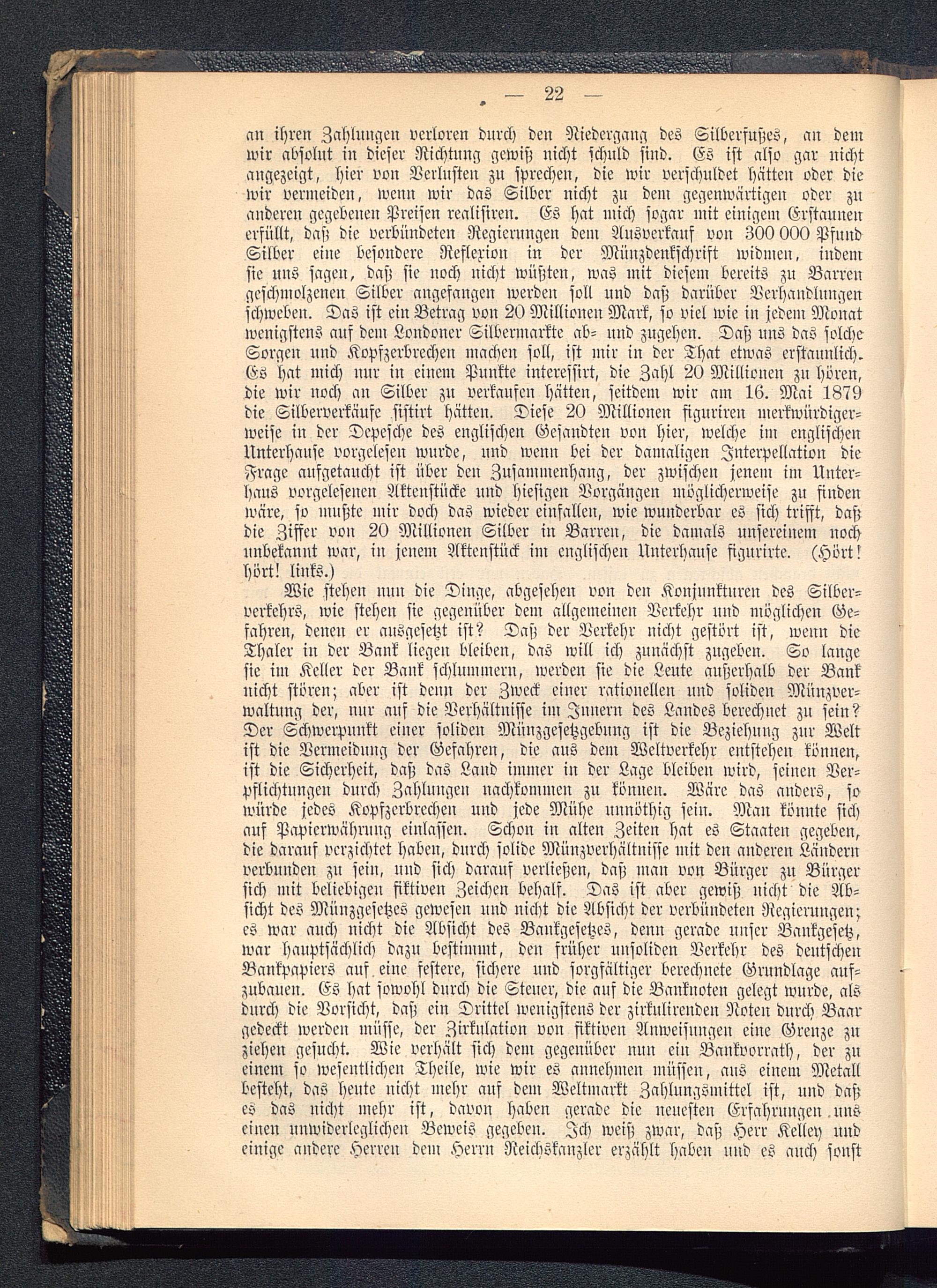 an ihren Zahlungen verloren durch den Niedergang des SilberfußeS, an demwir absolut in dieser Richtung gewiß nicht schuld sind. Es ist also gar nichtaugezeigt, hier von Verlusten zu sprechen, die wir verschuldet hätten oder diewir vermeideu, wenn wir das Silber nicht zu dem gegenwärtigen oder zuanderen gegebenen Preisen realisiren. ES hat mich sogar mit einigem Erstannenerfüllt, das; die verbündeten Regierungen dem Ausverkauf von 300 000 PsnndSilber eine besondere Reflexion in der Münzdenkschrift widmen, indemsie uns sagen, daß sie noch nicht wüßten, was mit diesem bereits zu Barrengeschmolzenen Silber angefangen werden soll und daß darüber Verhandlungenschweben. Das ist ein Betrag von 20 Millionen Mark, so viel wie in jedem Monatwenigstens auf dem Londoner Silbermarkte ab- und zugehen. Daß nns das solcheSorgen und Kopfzerbrechen machen soll, ist mir in der That etwas erstaunlich.Es hat mich nur in einem Punkte interessirt, die Zahl 20 Millionen zn hören,die wir noch an Silber zu verkaufen hätten, seitdem wir am 16. Mai 1879die Silberverkäufe sistirt hätten. Diese 20 Millionen figuriren merkwürdiger-weise iu der Depesche des englischen Gesandten von hier, welche im englischenNnterhanse vorgelesen wurde, und wenn bei der damaligen Interpellation dieFrage aufgetaucht ist über den Zusammenhang, der zwischen jenem im Unter-haus vorgelesenen Aktenstücke und hiesigen Vorgängen möglicherweise zu findenwäre, so mußte mir doch das wieder einfallen, wie wunderbar es sich trifft, daßdie Ziffer von 20 Millionen Silber in Barren, die damals nnsereinem nochunbekannt war, in jenem Aktenstück im englischen Unterbause sigurirte. (Hört!hört! links.)
