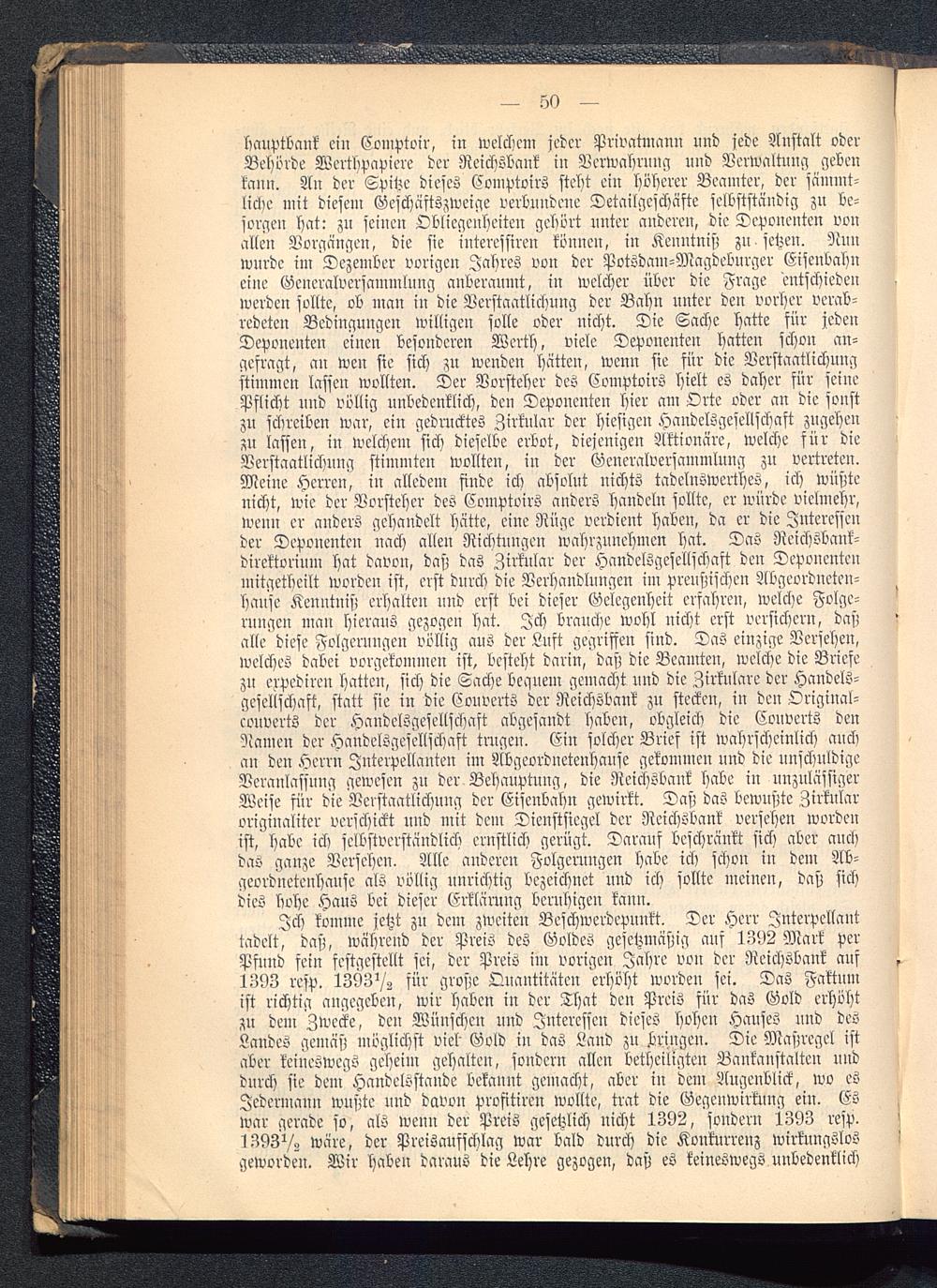 bauptbank ein Comptoir, in welchem jeder Privatmann und jede Anstalt oderBehörde Werthpapiere der Ncichsbank in Verwahrung und Verwaltung gebenkann. An der Spitze dieses Comptoirs steht ein höherer Beamter, der sämmt-liche mit diesem Geschäftszweige verbundene Detailgcschäfte selbstständig zu be-sorgen hat: zu seinen Obliegenheiten gehört unter anderen, die Deponenten vonallen Vorgängen, die sie interessiren können, in Kenntniß zu setzen. Nuuwurde im Dezember vorigen Jahres von der Potsdam -Magdcbnrger Eisenbahneine Gcneralvcrsammlnng anberaumt, in welcher über die Frage entschiedenwerden sollte, ob man in die Verstaatlichung der Bahn unter den vorher verab-redeten Bedingungen willigen solle oder nicht. Die Sache hatte für jedenDeponenten einen besonderen Werth, viele Deponenten hatten schon an-gefragt, an wen sie sich zu wenden hätten, wenn sie für die Verstaatlichungstimmen lassen wollten. Der Vorsteher des Comptoirs hielt es daher für seinePflicht uud völlig unbedenklich, den Deponenten hier am Orte oder an die sonstzu schreiben war, ein gedrucktes Zirkular der hiesigen Handelsgesellschaft zngehenzu lassen, in welchem sich dieselbe erbot, diejenigen Aktionäre, welche für dieVerstaatlichung stimmten wollten, in der Generalversammlung zn vertreten.Meine Herren, in alledem finde ich absolut nichts tadelnswcrthes, ich wüßtenicht, wie der Vorsteher des Comptoirs anders handeln sollte, er würde vielmehr,wenn er anders gehandelt hätte, eine Rüge verdient haben, da er die Interessender Deponenten nach allen Richtungen wahrzunehmen hat. Das NeichSbank-direktorium hat davon, daß das Zirkular der Handelsgesellschaft den Deponentenmitgetheilt worden ist, erst durch die Verhandlungen im preußischen Abgeordueteu-hause Keuutuiß erhalten uud erst bei dieser Gelegenheit erfahren, welche Folge-rungen man hieraus gezogen hat. Ich brauche wohl uicht erst versichern, daßalle diese Folgerungen völlig aus der Luft gegriffen sind. Das einzige Versehen,welches dabei vorgekommen ist, besteht darin, daß die Beamten, welche die Briefezu expediren hatten, sich die Sache bequem gemacht und die Zirkulare der Handels-gesellschaft, statt sie in die Couverts der Ncichsbank zu stecken, in den Original-couverts dcr Handelsgesellschaft abgesandt haben, obgleich die Converts denNamen der Handelsgesellschaft trugen. Ein solcher Brief ist wahrscheinlich auchan den Herrn Interpellanten im Abgeordnetenhause gekommen nnd die unschuldigeVeranlassung gewesen zn der Behauptung, die Reichsbank habe in unzulässigerWeise für die Verstaatlichung der Eisenbahn gewirkt. Daß daS bewußte Zirkularoriginalster verschickt nnd mit dem Dienstsiegel der Reichsbank versehen wordenist, habe ich selbstverständlich ernstlich gerügt. Darauf beschränkt sich aber anchdas ganze Verschen. Alle anderen Folgerungen habe ich schon in dem Ab-geordneteuhanse als völlig unrichtig bezeichnet und ich sollte meinen, daß sichdieS bohe Haus bei dieser Erklärung beruhigen kann.