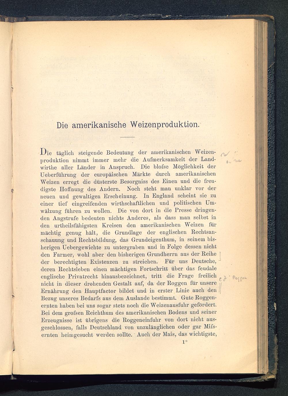 U ie täglich steigende Bedeutung der amerikanischen Weizen-Produktion nimmt immer mehr die Aufmerksamkeit der Land-wirthe aller Länder in Anspruch. Die blofse Möglichkeit derUeberführung der europäischen Märkte durch amerikanischenWeizen erregt die düsterste Besorgniss des Einen und die freu-digste Hoffnung des Andern. Noch steht mau unklar vor derneuen und gewaltigen Erscheinung. In England scheint sie zueiner tief eingreifenden wirthschaftlichen und politischen Um-wälzung führen zu wollen. Die von dort in die Presse dringen-den Angstrufe bedeuten nichts Anderes, als dass man selbst inden urtlieilsfähigsten Kreisen den amerikanischen Weizen fürmächtig genug hält, die Grundlage der englischen Rechtsan-schauung und Rechtsbildung, das Grundeigenthum, in seinem bis-herigen Uebergewichte zu untergraben und in Folge dessen nichtden Farmer, wohl aber den bisherigen Grundherrn aus der Reihe |der berechtigten Existenzen zu streichen. Für uns Deutsche , Jderen Rechtsleben einen mächtigen Fortschritt über das feudaleenglische Privatrecht hinausbezeichnet, tritt die Frage freilich ^ •nicht in dieser drohenden Gestalt auf, da der Roggen für unsere n'Ernährung den Hauptfactor bildet und in erster Linie auch den ![Bezug unseres Bedarfs aus dem Auslande bestimmt. Gute Roggen-ernten haben bei uns sogar stets noch die Weizenausfuhr gefördert.