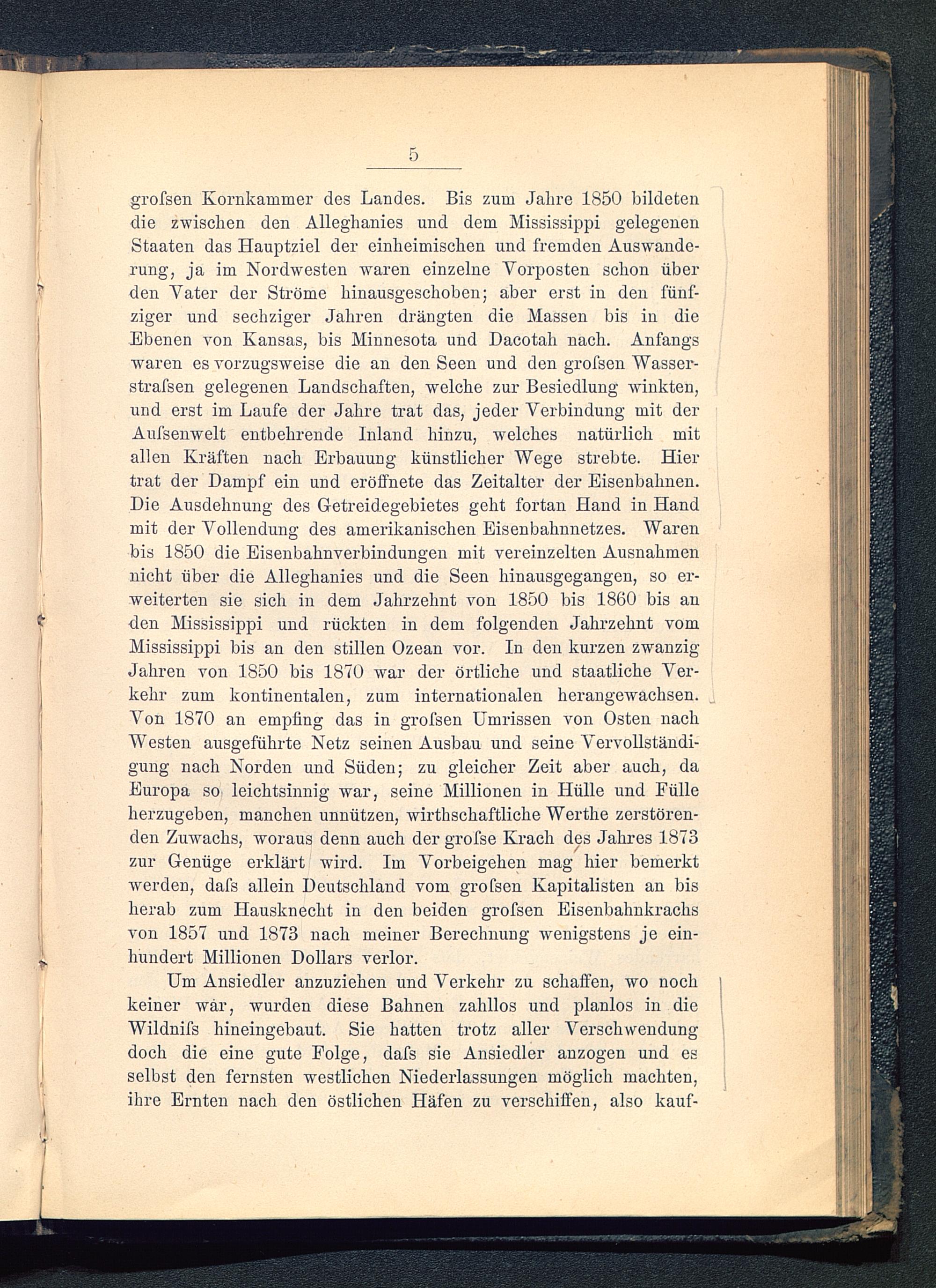 grofsen Kornkammer des Landes. Bis zum Jahre 1850 bildetendie zwischen den Alleghanies und dem Mississippi gelegenenStaaten das Hauptziel der einheimischen und fremden Auswande-rung, ja im Nordwesten waren einzelne Vorposten schon überden Vater der Ströme hinausgeschoben; aber erst in den fünf-ziger und sechziger Jahren drängten die Massen bis in dieEbenen von Kansas , bis Minnesota und Dacotah nach. Anfangswaren es vorzugsweise die an den Seen und den grofsen Wasser-strafsen gelegenen Landschaften, welche zur Besiedlung winkten,und erst im Laufe der Jahre trat das, jeder Verbindung mit derAufsenwelt entbehrende Inland hinzu, welches natürlich mitallen Kräften nach Erbauung künstlicher Wege strebte. Hiertrat der Dampf ein und eröffnete das Zeitalter der Eisenbahnen.Die Ausdehnung des Getreidegebietes geht fortan Hand in Handmit der Vollendung des amerikanischen Eisenbahnnetzes. Warenbis 1850 die Eisenbahnverbindungen mit vereinzelten Ausnahmennicht über die Alleghanies und die Seen hinausgegangen, so er-weiterten sie sich in dem Jahrzehnt von 1850 bis 1860 bis anden Mississippi und rückten in dem folgenden Jahrzehnt vomMississippi bis an den stillen Ozean vor. In den kurzen zwanzigJahren von 1850 bis 1870 war der örtliche und staatliche Ver-kehr zum kontinentalen, zum internationalen herangewachsen.Von 1870 an empfing das in grofsen Umrissen von Osten nachWesten ausgeführte Netz seinen Ausbau und seine Vervollständi-gung nach Norden und Süden; zu gleicher Zeit aber auch, daEuropa so leichtsinnig war, seine Millionen in Hülle und Fülleherzugeben, manchen unnützen, wirthschaftliche Werthe zerstören-den Zuwachs, woraus denn auch dergrofse Krach des Jahres 1873zur Genüge erklärt wird. Im Vorbeigehen mag hier bemerktwerden, dafs allein Deutschland vom grofsen Kapitalisten an bisherab zum Hausknecht in den beiden grofsen Eisenbahnkrachsvon 1857 und 1873 nach meiner Berechnung wenigstens je ein-hundert Millionen Dollars verlor.