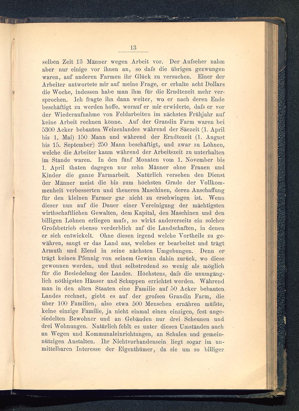 selben Zeit 1B Männer wegen Arbeit vor. Der Aufseher nahmaber nur einige vor ihnen an, so dafs die übrigen gezwungenwaren, auf anderen Farmen ihr Glück zu versuchen. Einer derArbeiter antwortete mir auf meine Frage, er erhalte acht Dollarsdie Woche, indessen habe man ihm für die Erndtezeit mehr ver-sprochen. Ich fragte ihn dann weiter, wo er nach deren Endebeschäftigt zu werden hoffe, worauf er mir erwiderte, dafs er vorder Wiederaufnahme von Feldarbeiten im nächsten Frühjahr aufkeine Arbeit rechnen könne. Auf der Grandin Farm waren bei5300 Acker bebauten Weizenlandes während der Säezeit (1. Aprilbis 1. Mai) 150 Mann und während der Erndtezeit (1. Augustbis 15. September) 250 Mann beschäftigt, und zwar zu Löhnen,welche die Arbeiter kaum während der Arbeitszeit zu unterhaltenim Stande waren. In den fünf Monaten vom 1. November bis1. April thaten dagegen nur zehn Männer ohne Frauen undKinder die ganze Farmarbeit. Natürlich versehen den Dienstder Männer meist die bis zum höchsten Grade der Vollkom-menheit verbesserten und theueren Maschinen, deren Anschaffungfür den kleinen Farmer gar nicht zu erschwingen ist. Wenndieser nun auf die Dauer einer Vereinigung der mächtigstenwirtschaftlichen Gewalten, dem Kapital, den Maschinen und denbilligen Löhnen erliegen mufs, so wirkt andererseits ein solcherGrofsbetrieb ebenso verderblich auf die Landschaften, in denener sich entwickelt. Ohne diesen irgend welche Vortheile zu ge-währen, saugt er das Land aus, welches er bearbeitet und trägtArmuth und Elend in seine nächsten Umgebungen. Denn erträgt keinen Pfennig von seinem Gewinn dahin zurück, wo diesegewonnen werden, und thut selbstredend so wenig als möglichfür die Besiedelung des Landes. Höchstens, dafs die unumgäng-lich nötigsten Häuser und Schuppen errichtet werden. Währendman in den alten Staaten eine Familie auf 50 Acker bebautenLandes rechnet, giebt es auf der grofsen Grandin Farm, dieüber 100 Familien, also etwa 500 Menschen ernähren müfste,keine einzige Familie, ja nicht einmal einen einzigen, fest ange-siedelten Bewohner und an Gebäuden nur drei Scheunen unddrei Wohnungen. Natürlich fehlt es unter diesen Umständen auchan Wegen und Kommunaleinrichtungen, an Schulen und gemein-nützigen Anstalten. Ihr Nichtvorhandensein liegt sogar im un-mittelbaren Interesse der Eigentümer, da sie um so billiger