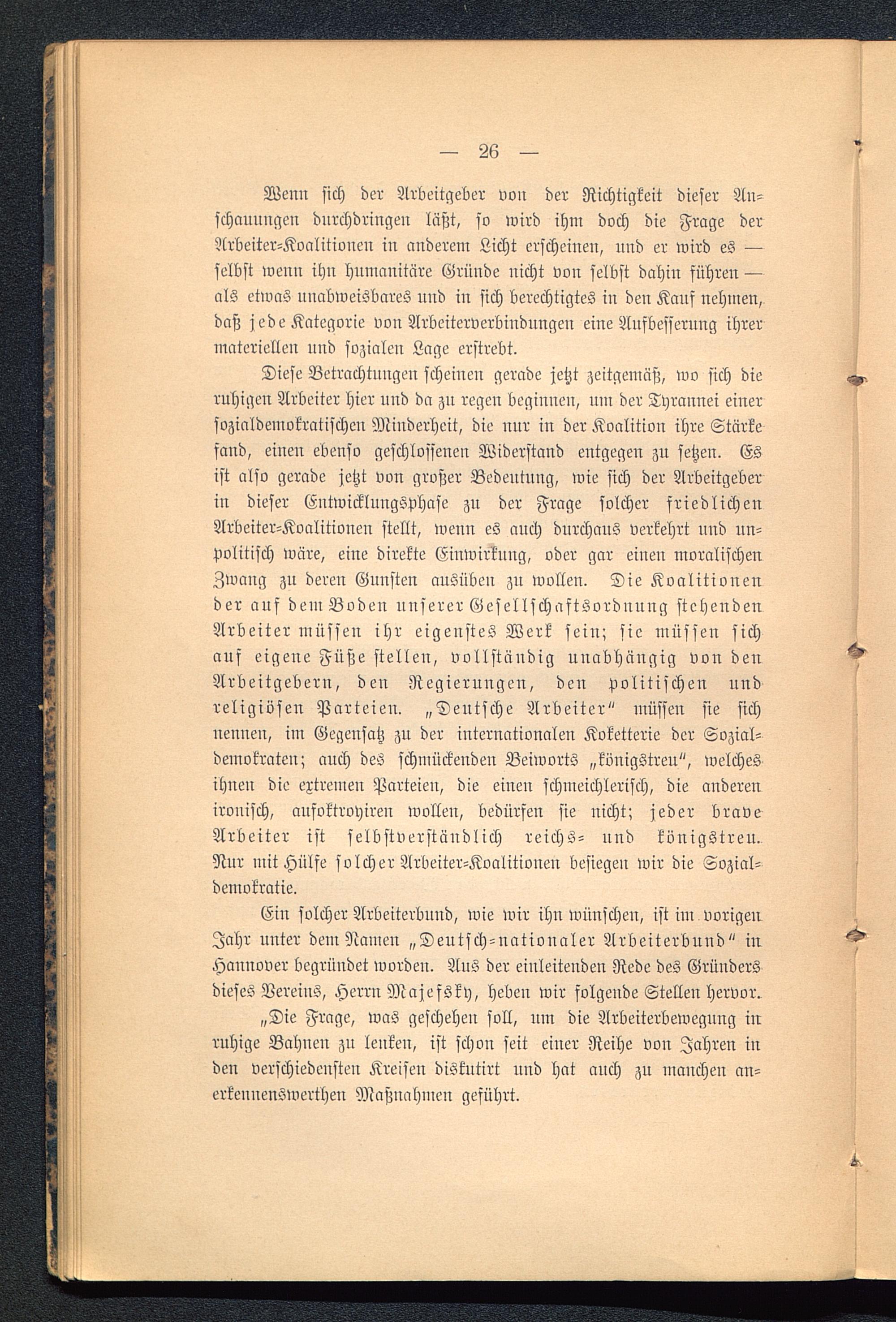 Diese Betrachtungen scheinen gerade jetzt zeitgemäß, wo sich dieruhigen Arbeiter hier und da zu regen beginnen, um der Tyrannei einersozialdemokratischen Minderheit, die nur in der Koalition ihre Stärkesand, einen ebenso geschlossenen Widerstand entgegen zu sehen. Esist also gerade jetzt von großer Bedeutung, wie sich der Arbeitgeberin dieser Entwicklungsphase zu der Frage solcher friedlichenArbeiter-Koalitionen stellt, wenn es auch durchaus verkehrt und un-politisch wäre, eine direkte Einwirkung, oder gar einen moralischenZwang zu deren Gunsten ausüben zu wollen. Die Koalitionender auf dem Boden unserer Gesellschaftsordnung stehendenArbeiter müsseu ihr eigenstes Werk sein; sie müssen sichauf eigene Füße stellen, vollständig unabhängig von denArbeitgebern, den Regierungen, den politischen undreligiösen Parteien. „Deutsche Arbeiter" müssen sie sichueuueu, im Gegensatz zu der internationalen Koketterie der Sozial-demokraten; auch des schmückenden Beiworts „königstreu", welchesihnen die extremen Parteien, die einen schmeichlerisch, die anderenironisch, aufoktroyiren wollen, bedürfen sie nicht; jeder braveArbeiter ist selbstverständlich reichS- uud königstreu.Nur mit Hülfe solcher Arbeiter-Koalitionen besiegen wir die Sozial-demokratie.