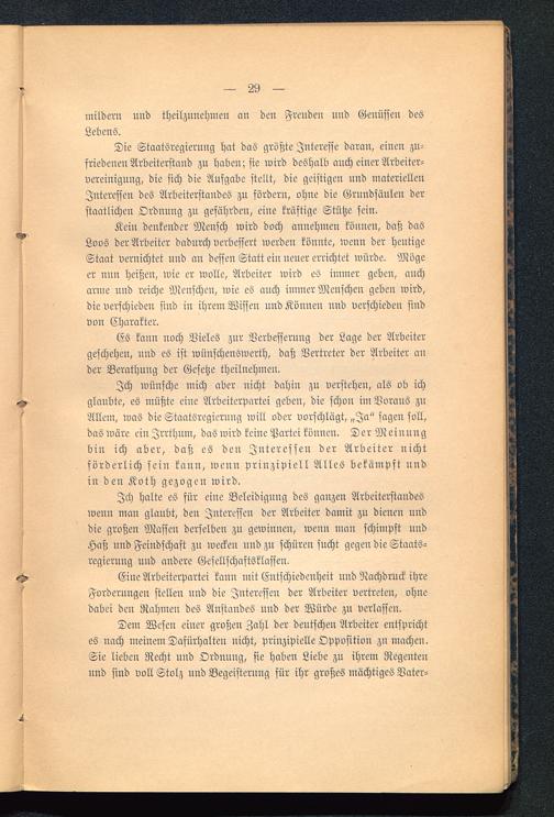Dem Wesen einer großen Zahl der deutschen Arbeiter entsprichtes uach meinem Dafürhalten nicht, prinzipielle Opposition zn machen.Sie lieben Recht und Ordnung, sie haben Liebe zu ihrem Regentenund sind voll Stolz und Begeisterung für ihr großes mächtiges Vater-