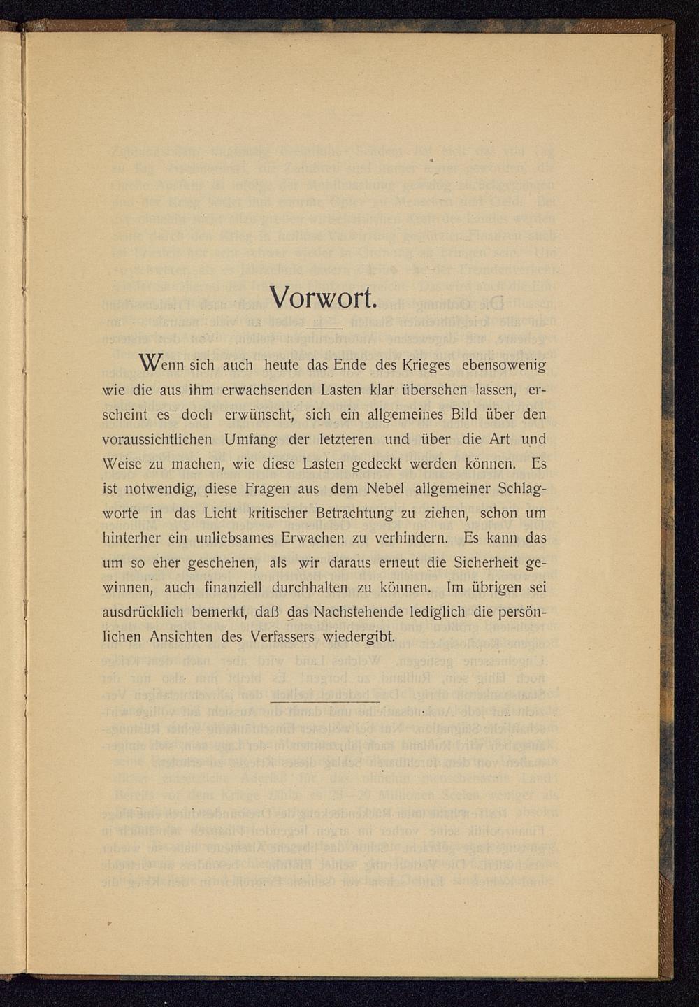 VG^enn sich auch heute das Ende des Krieges ebensowenigwie die aus ihm erwachsenden Lasten klar übersehen lassen, er-scheint es doch erwünscht, sich ein allgemeines Bild über denvoraussichtlichen Umfang der letzteren und über die Art undWeise zu machen, wie diese Lasten gedeckt werden können. Esist notwendig, diese Fragen aus dem Nebel allgemeiner Schlag-worte in das Licht kritischer Betrachtung zu ziehen, schon umhinterher ein unliebsames Erwachen zu verhindern. Es kann dasum so eher geschehen, als wir daraus erneut die Sicherheit ge-winnen, auch finanziell durchhalten zu können. Im übrigen seiausdrücklich bemerkt, daß das Nachstehende lediglich die persön-lichen Ansichten des Verfassers wiedergibt.