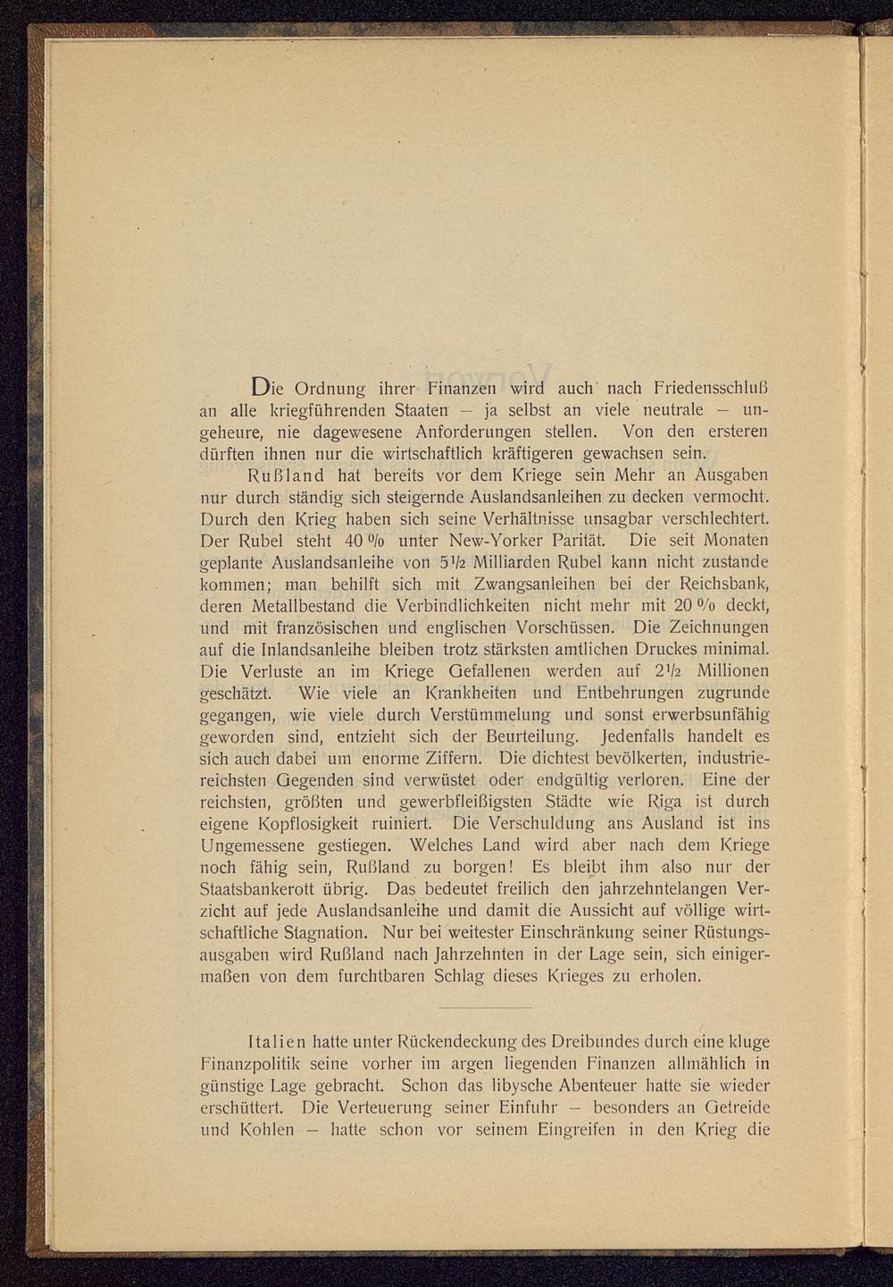 Italien hatte unter Rückendeckung des Dreibundes durch eine klugeFinanzpolitik seine vorher im argen liegenden Finanzen allmählich ingünstige Lage gebracht. Schon das libysche Abenteuer hatte sie wiedererschüttert. Die Verteuerung seiner Einfuhr - besonders an Getreideund Kohlen — hatte schon vor seinem Eingreifen in den Krieg die