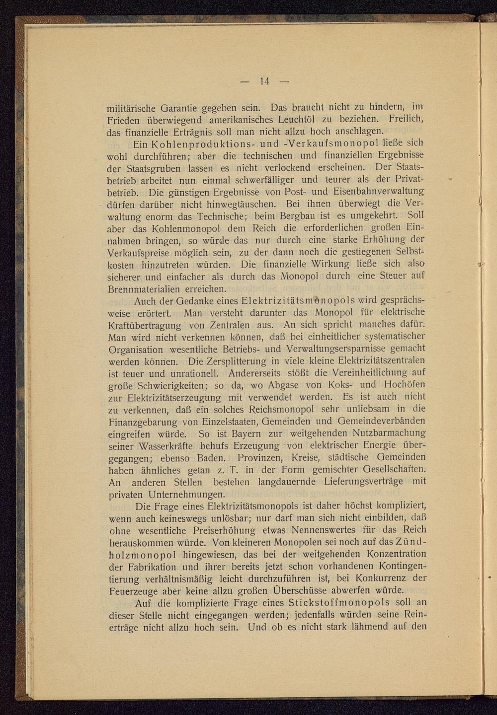 Ein Kohlenproduktions- und -Verkaufsmonopol ließe sichwohl durchführen; aber die technischen und finanziellen Ergebnisseder Staatsgruben lassen es nicht verlockend erscheinen. Der Staats-betrieb arbeitet nun einmal schwerfälliger und teurer als der Privat-betrieb. Die günstigen Ergebnisse von Post- und Eisenbahnverwaltungdürfen darüber nicht hinwegtäuschen. Bei ihnen überwiegt die Ver-waltung enorm das Technische; beim Bergbau ist es umgekehrt. Sollaber das Kohlenmonopol dem Reich die erforderlichen großen Ein-nahmen bringen, so würde das nur durch eine starke Erhöhung derVerkaufspreise möglich sein, zu der dann noch die gestiegenen Selbst-kosten hinzutreten würden. Die finanzielle Wirkung ließe sich alsosicherer und einfacher als durch das Monopol durch eine Steuer aufBrennmaterialien erreichen.
