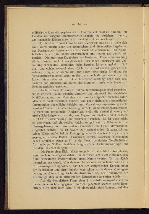 Die Frage eines Elektrizitätsmonopols ist daher höchst kompliziert,wenn auch keineswegs unlösbar; nur darf man sich nicht einbilden, daßohne wesentliche Preiserhöhung etwas Nennenswertes für das Reichherauskommen würde. Von kleineren Monopolen sei noch auf das Zünd-holzmonopol hingewiesen, das bei der weitgehenden Konzentrationder Fabrikation und ihrer bereits jetzt schon vorhandenen Kontingen-tierung verhältnismäßig leicht durchzuführen ist, bei Konkurrenz derFeuerzeuge aber keine allzu großen Überschüsse abwerfen würde.