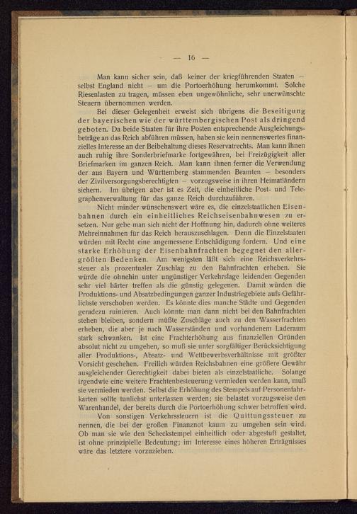 Von sonstigen Verkehrssteuerri ist die Quittungssteuer zunennen, die bei der großen Finanznot kaum zu umgehen sein wird.Ob man sie wie den Scheckstempel einheitlich oder abgestuft gestaltet,ist ohne prinzipielle Bedeutung; im Interesse eines höheren Erträgnisseswäre das letztere vorzuziehen.