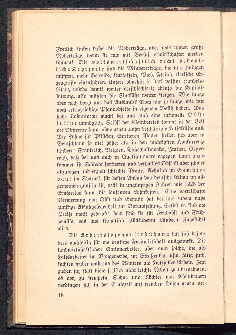 Freilich sinken dabei die Roherträge; aber was nützen großeRoherträge, wenn sie nur mit Verlust erwirtschaftet werdenkönnen! Die volkswirtschaftlich recht bedenk-liche Kehrseite sind die Mindererträge, die uns zwingenmüßten, mehr Getreide, Kartoffeln, Vieh, Fleisch, tierische Er-zeugnisse einzuführen. Unsere ohnehin so stark passive Handels-bilanz würde damit weiter verschlechtert; ebenso die Kapital-bildung, also müßten die Zinssätze weiter steigen. Wie langeaber noch borgt uns das Ausland? Doch nur so lange, wie wirnoch ertragsfähige Pfandobjekte in eigenem Besitz haben. Dashohe Lohnniveau macht bei uns auch eine rationelle Obst-kultur unmöglich. Selbst der Kleinbetrieb kommt in der Zeitder Obsternte kaum ohne gegen Lohn beschäftigte Hilfskräfte aus.Die Löhne für Pflücken, Sortieren, Packen stellen sich aber inDeutschland so viel höher als in den wichtigsten Konkurrenz-ländern: Frankreich, Belgien, Tschechoslowakei, Italien , Oester-reich, daß bei uns auch in Qualitätsware dagegen kaum anzu-kommen ist. Schlecht sortiertes und verpacktes Obst ist aber schwerabzusehen und erzielt schlechte Preise. Aehnlich im Gemüse-bau: im Spargel, für dessen Anbau das deutsche Klima im all-gemeinen günstig ist, deckt in ungünstigen Iahren wie 1928 derCrnteerlös kaum die laufenden Lohnkosten. Eine vorteilhasteVerwertung von Obst und Gemüse hat bei uns zudem nahegünstige Absatzgelegenheit zur Voraussetzung. Selbst da sind diePreise meist gedrückt; hoch sind sie für Frühobst und Früh-gemüse, das aus klimatisch glücklicheren Ländern eingeführtwird.