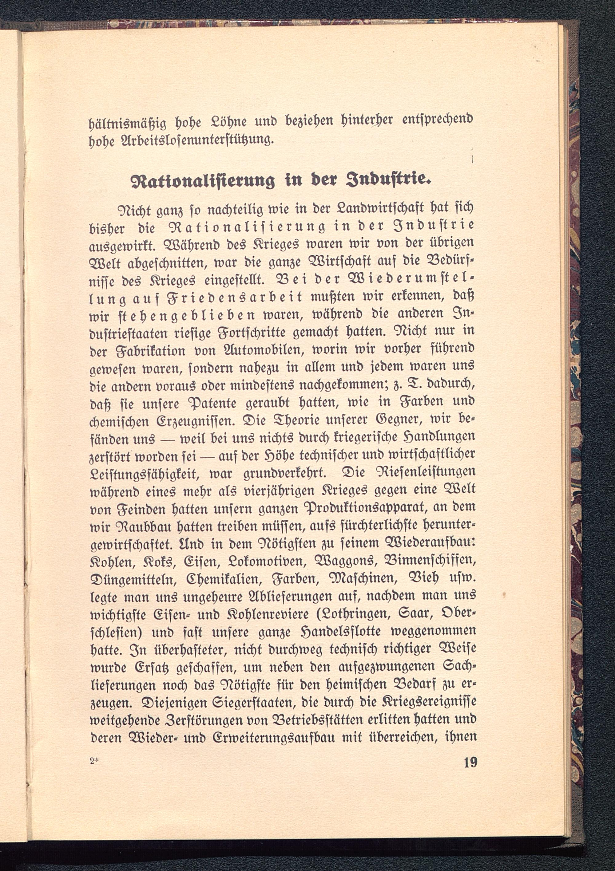 Nicht ganz so nachteilig wie in der Landwirtschaft hat sichbisher die Rationalisierung in der Industrieausgewirkt. Während des Krieges waren wir von der übrigenWelt abgeschnitten, war die ganze Wirtschaft auf die Bedürf-nisse des Krieges eingestellt. Vei der Wiederumstel-lung auf Friedensarbeit mußten wir erkennen, daßwir stehengeblieben waren, während die anderen In-dustriestaaten riesige Fortschritte gemacht hatten. Nicht nur inder Fabrikation von Automobilen, worin wir vorher führendgewesen waren, sondern nahezu in allem und jedem waren unsdie andern voraus oder mindestens nachgekommen; z. T. dadurch,daß sie unsere Patente geraubt hatten, wie in Farben undchemischen Erzeugnissen. Die Theorie unserer Gegner, wir be-fänden uns — weil bei uns nichts durch kriegerische Handlungenzerstört worden sei — auf der Höhe technischer und wirtschaftlicherLeistungsfähigkeit, war grundverkehrt. Die Riesenleistungenwährend eines mehr als vierjährigen Krieges gegen eine Weltvon Feinden hatten unfern ganzen Produktionsapparat, an demwir Raubbau hatten treiben müssen, aufs fürchterlichste herunter-gewirtschaftet. Und in dem Nötigsten zu seinem Wiederaufbau:Kohlen, Koks, Eisen, Lokomotiven, Waggons, Vinnenschiffen,Düngemitteln, Chemikalien, Farben, Maschinen, Vieh usw.legte man uns ungeheure Ablieferungen auf, nachdem man unswichtigste Eisen- und Kohlenreviere (Lothringen, Saar, Ober-schlesien ) und fast unsere ganze Handelsflotte weggenommenhatte. In überhasteter, nicht durchweg technisch richtiger Weisewurde Ersatz geschaffen, um neben den aufgezwungenen Sach-lieferungen noch das Nötigste für den heimischen Bedarf zu er-zeugen. Diejenigen Siegerstaaten, die durch die Kriegsereignisseweitgehende Zerstörungen von Betriebsstätten erlitten hatten undderen Wieder- und Crweiterungsaufbau mit überreichen, ihnen