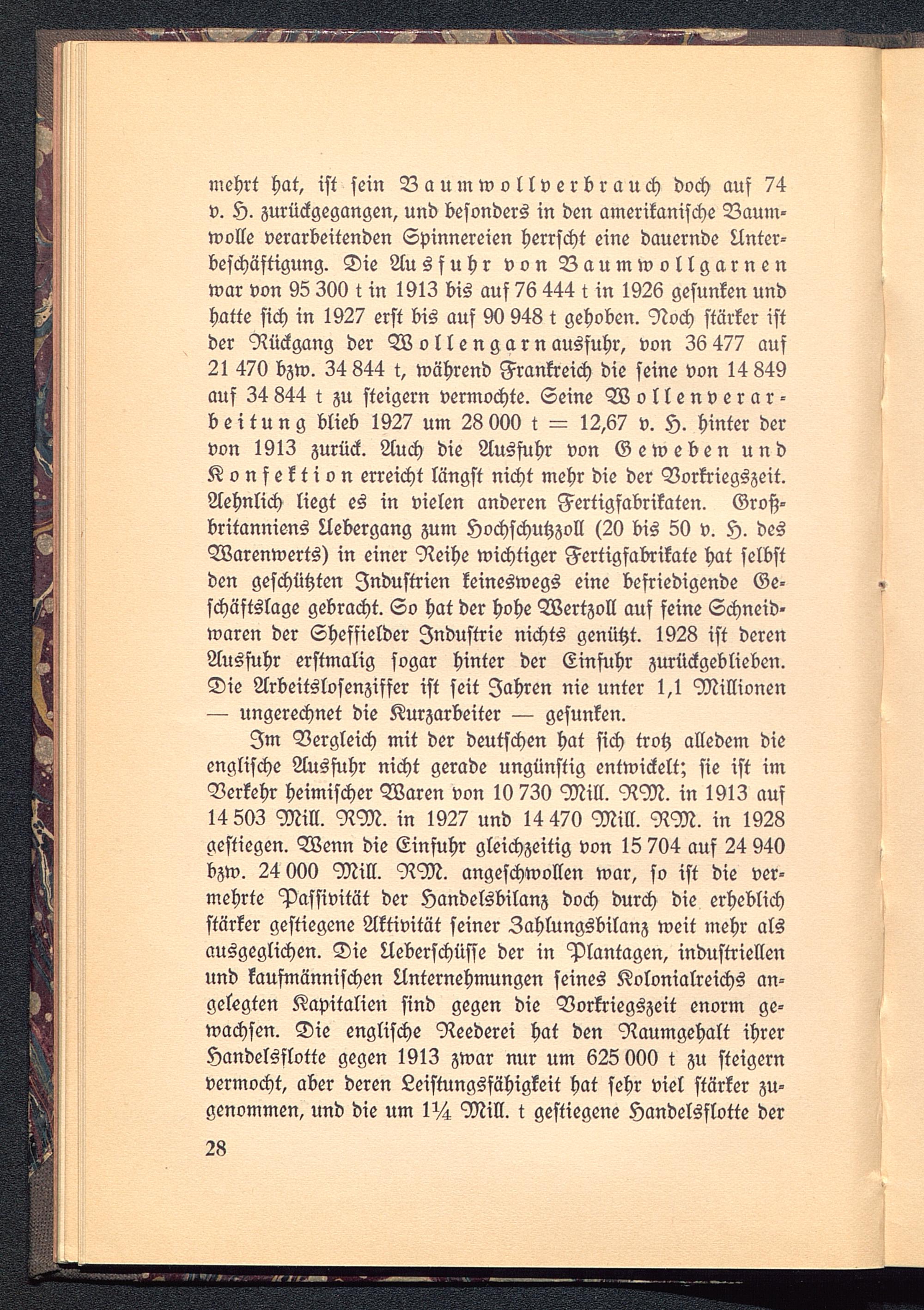mehrt hat, ist sein Baum wollverbrauch doch auf 74v. H. zurückgegangen, und besonders in den amerikanische Baum-wolle verarbeitenden Spinnereien herrscht eine dauernde Unter-beschäftigung. Die Ausfuhr von Baumwollgarnenwar von 95 300 t in 1913 bis auf 76 444 t in 1926 gesunken undhatte sich in 1927 erst bis auf 90 948 t gehoben. Noch stärker istder Rückgang der W ollengarnausfuhr, von 36 477 auf21 470 bzw. 34 844 t, während Frankreich die seine von 14 849auf 34 844 t zu steigern vermochte. Seine Wollenverar-beitung blieb 1927 um 28 000 t ^ 12,67 v. H. hinter dervon 1913 zurück. Auch die Ausfuhr von Geweben undKonfektion erreicht längst nicht mehr die der Vorkriegszeit.Aehnlich liegt es in vielen anderen Fertigfabrikaten. Groß-britanniens Aebergang zum Hochschutzzoll (20 bis 50 v. H. desWarenwerts) in einer Reihe wichtiger Fertigfabrikate hat selbstden geschützten Industrien keineswegs eine befriedigende Ge-schäftslage gebracht. So hat der hohe Wertzoll auf feine Schneid-waren der Sheffielder Industrie nichts genützt. 1928 ist derenAusfuhr erstmalig sogar hinter der Einfuhr zurückgeblieben.Die Arbeitslosenziffer ist seit Iahren nie unter 1,1 Millionen— ungerechnet die Kurzarbeiter — gesunken.