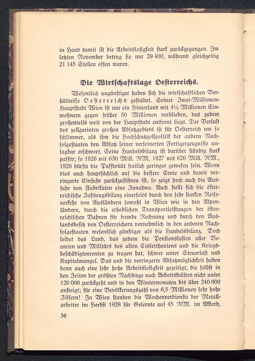 Wesentlich ungünstiger haben sich die wirtschaftlichen Ver-hältnisse Oesterreichs gestaltet. Seiner Zwei-Millionen-Hauptstadt Wien ist nur ein Hinterland mit 4^2 Millionen Ein-wohnern gegen früher 50 Millionen verblieben, das zudemgroßenteils weit von der Hauptstadt entfernt liegt. Der Verlustdes zollgeeinten großen Absatzgebiets ist für Oesterreich um soschlimmer, als ihm die Hochschutzzollpolitik der andern Nach-folgestaaten den Absatz seiner verfeinerten Fertigerzeugnisse un-sagbar erschwert. Seine Handelsbilanz ist darüber ständig starkpassiv; so 1926 mit 630 Mill. NM, 1927 mit 620 Mill. NM,1928 dürfte die Passivität freilich geringer gewesen sein. Wenndies auch hauptsächlich auf die bessere Ernte und damit ver-ringerte Einfuhr zurückzuführen ist, so zeigt doch auch die Aus-fuhr von Fabrikaten eine Zunahme. Auch stellt sich die öster-reichische Zahlungsbilanz einerseits durch den sehr starken Reise-verkehr von Ausländern sowohl in Wien wie in den Alpen-ländern, durch die erheblichen Transportleistungen der öster-reichischen Bahnen für fremde Rechnung und durch den Aus-landsbesitz von Oesterreichern vornehmlich in den anderen Nach-folgestaaten wesentlich günstiger als die Handelsbilanz. Dochleidet das Land, das zudem die Pensionslasten aller Be-amten und Militärs des alten Cisleithaniens und die Kriegs-beschädigtenrenten zu tragen hat, schwer unter Steuerlast undKapitalmangel. Das und die verringerte Absahmöglichkeit habendenn auch eine sehr hohe Arbeitslosigkeit gezeitigt, die selbst inden Zeiten der größten Nachfrage nach Arbeitskräften nicht unter120 000 zurückgeht und in den Wintermonaten bis über 240 000ansteigt; für eine Bevölkerungszahl von 6,5 Millionen sehr hoheZiffern! In Wien standen die Wochenverdienste der Metall-arbeiter im Herbst 1928 für Gelernte auf 45 NM. im Akkord,
