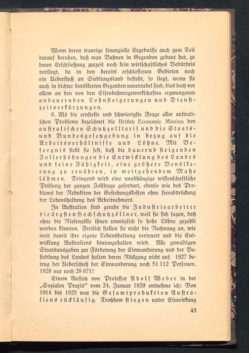6. Als die ernsteste und schwierigste Frage aller australi-schen Probleme bezeichnet die Lritisn Economic Ni88ic>n denaustralischen Schutzzolltarif und die Staats-und Vundesgesetzgebung in bezug auf dieArbeitsverhältnisse und Löhne. Mit Be-sorgnis stellt sie fest, daß die dauernd steigendenZollerhöhungen die Entwicklung des Landesund seine Fähigkeit, eine größere Bevölke-rung zu ernähren, in weitgehendem Maßelähmen. Dringend wird eine unabhängige wissenschaftlichePrüfung der ganzen Zollfrage gefordert, ebenso wie des Pro-blems der Reduktion der Gestehungskosten ohne Herabdrückungder Lebenshaltung des Arbeitnehmers.