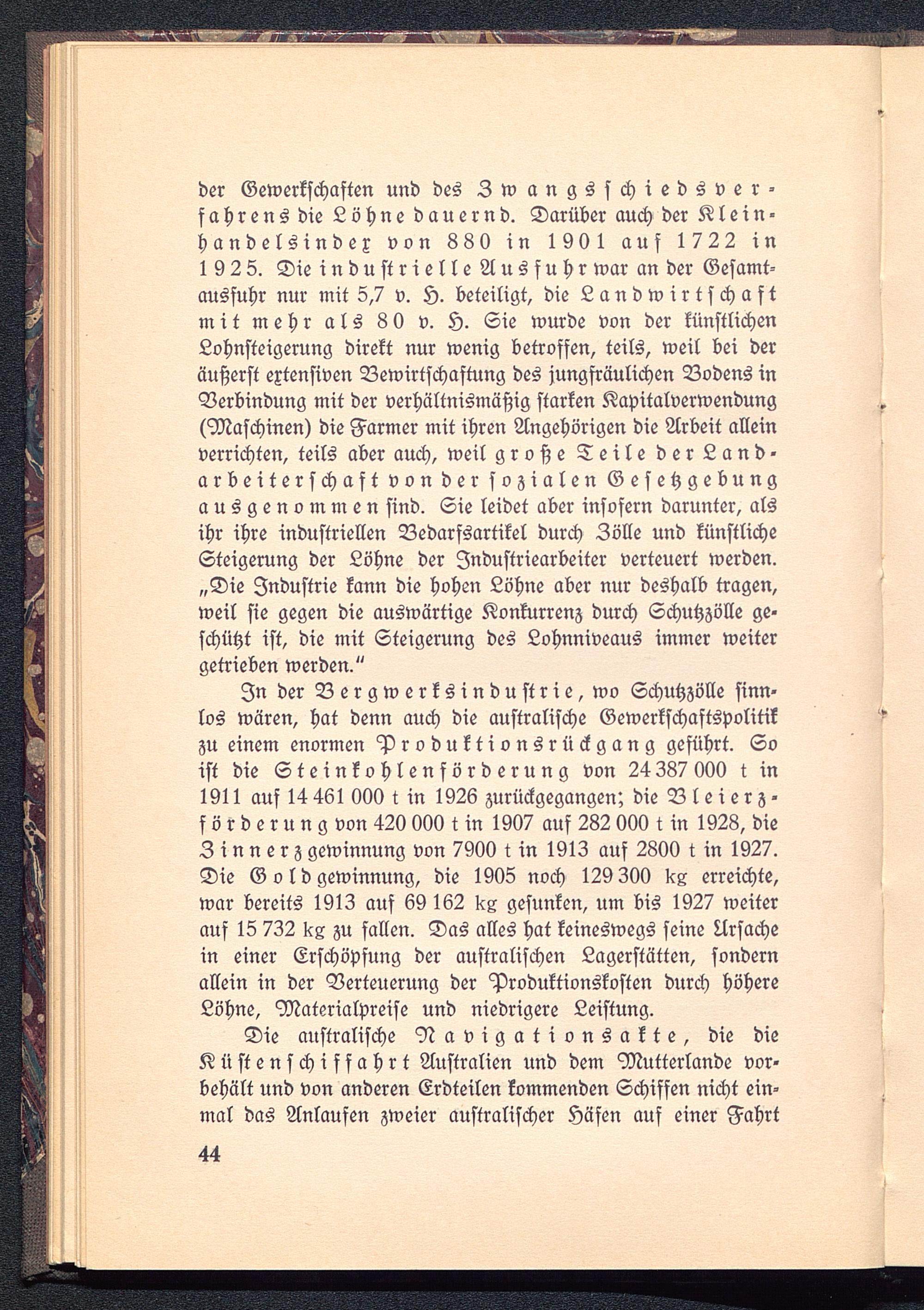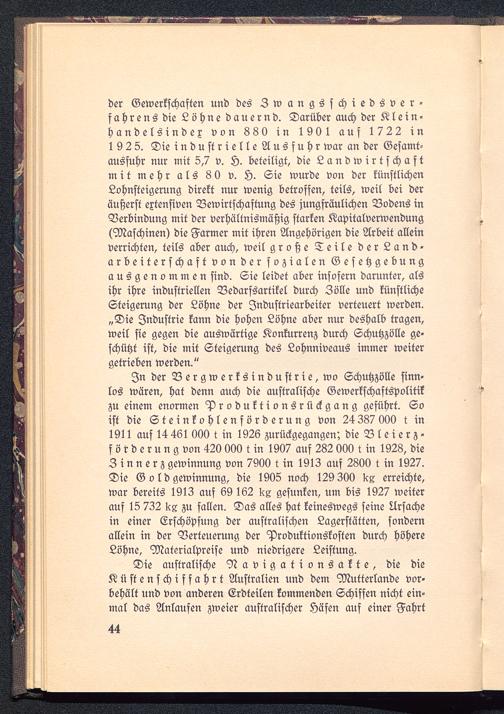 In der Vergwerksindustrie,wo Schutzzölle sinn-los wären, hat denn auch die australische Gewerkschaftspolitikzu einem enormen Produktionsrückgang geführt. Soist die Steinkohlenförderung von 24387000 t in1911 auf 14 461 000 t in 1926 zurückgegangen; dieVleierz -förderungvon 420 000 tin 1907 auf 282 000 t in 1928, dieZinnerz gewinnung von 7900 t in 1913 auf 2800 t in 1927.Die Goldgewinnung, die 1905 noch 129 300 KZ erreichte,war bereits 1913 auf 69 162 Ks gesunken, um bis 1927 weiterauf 15 732 zu fallen. Das alles hat keineswegs seine Ursachein einer Erschöpfung der australischen Lagerstätten, sondernallein in der Verteuerung der Produktionskosten durch höhereLöhne, Materialpreise und niedrigere Leistung.