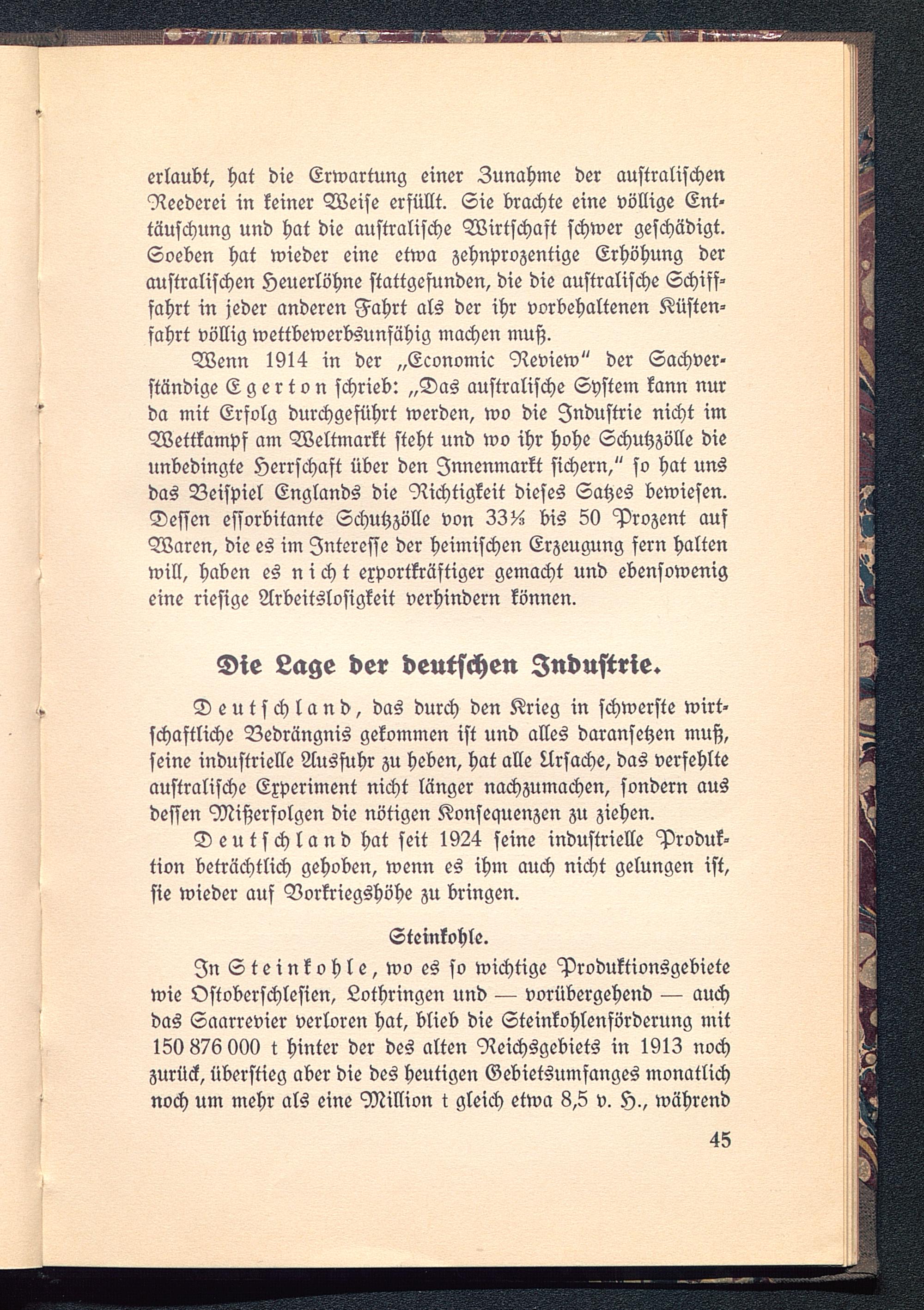 In Steinkohle, wo es so wichtige Produktionsgebietewie Ostoberschlesien, Lothringen und — vorübergehend — auchdas Saarrevier verloren hat, blieb die Steinkohlenförderung mit150 876 000 t hinter der des alten Reichsgebiets in 1913 nochzurück, überstieg aber die des heutigen Gebietsumfanges monatlichnoch um mehr als eine Million t gleich etwa 8,5 v. H., während