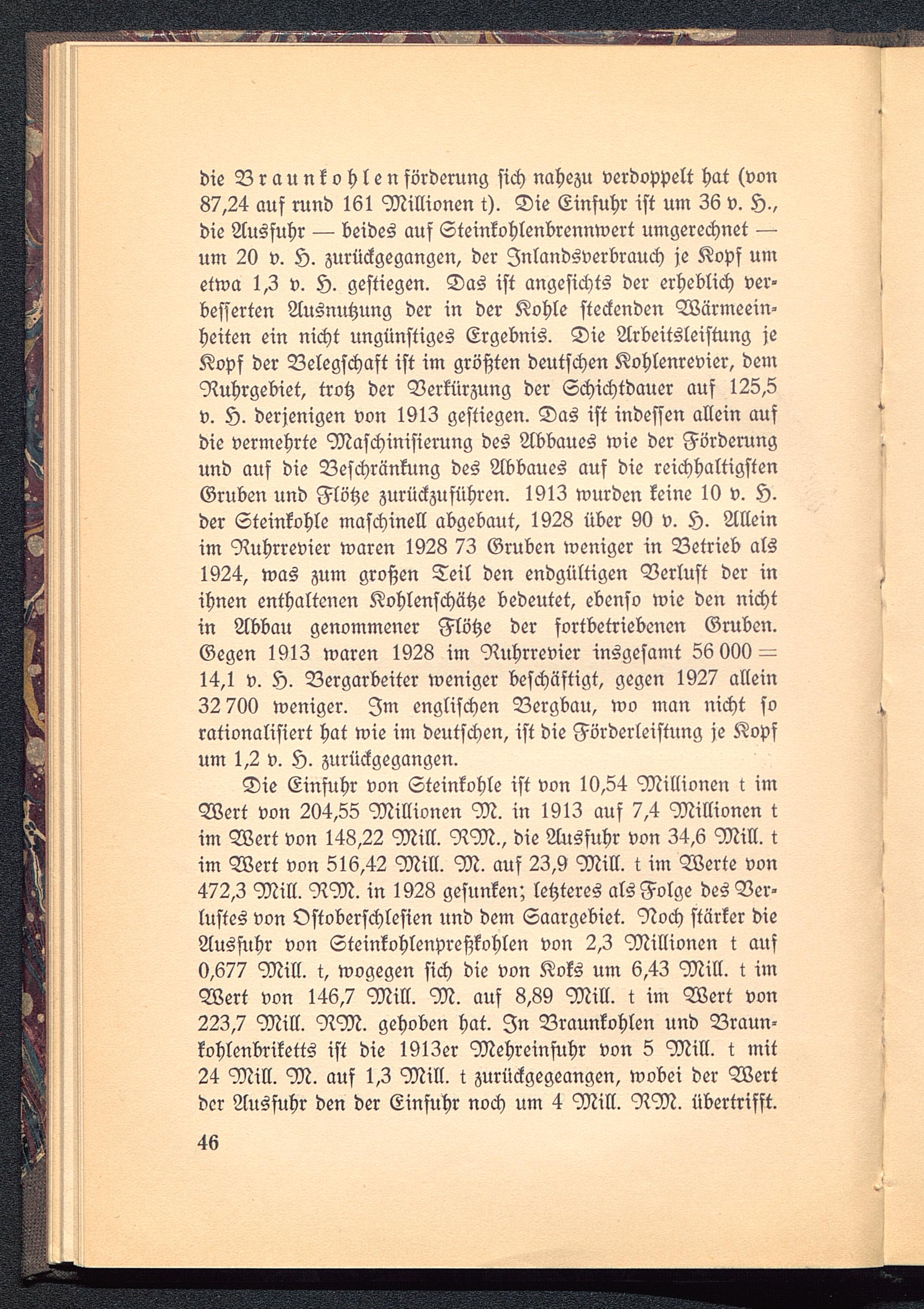die Braunkohlen förderung sich nahezu verdoppelt hat (von87,24 auf rund 161 Millionen t). Die Einfuhr ist um 36 v. H.,die Aussuhr — beides aus Steinkohlenbrennwert umgerechnet —um 20 v. H. zurückgegangen, der Inlandsverbrauch je Kopf umetwa 1,3 v. H. gestiegen. Das ist angesichts der erheblich ver-besserten Ausnutzung der in der Kohle steckenden Wärmeein-heiten ein nicht ungünstiges Ergebnis. Die Arbeitsleistung jeKopf der Belegschaft ist im größten deutschen Kohlenrevier, demRuhrgebiet , trotz der Verkürzung der Schichtdauer auf 125,5v. 5). derjenigen von 1913 gestiegen. Das ist indessen allein aufdie vermehrte Maschinisierung des Abbaues wie der Förderungund auf die Beschränkung des Abbaues auf die reichhaltigstenGruben und Flötze zurückzuführen. 1913 wurden keine 19 v. H.der Steinkohle maschinell abgebaut, 1928 über 90 v. H. Alleinim Ruhrrevier waren 1928 73 Gruben weniger in Betrieb als1924, was zum großen Teil den endgültigen Verlust der inihnen enthaltenen Kohlenschätze bedeutet, ebenso wie den nichtin Abbau genommener Flötze der fortbetriebenen Gruben.Gegen 1913 waren 1928 im Ruhrrevier insgesamt 56 000 —14,1 v. H. Bergarbeiter weniger beschäftigt, gegen 1927 allein32 700 weniger. Im englischen Bergbau, wo man nicht sorationalisiert hat wie im deutschen, ist die Förderleistung je Kopfum 1,2 v. H. zurückgegangen.