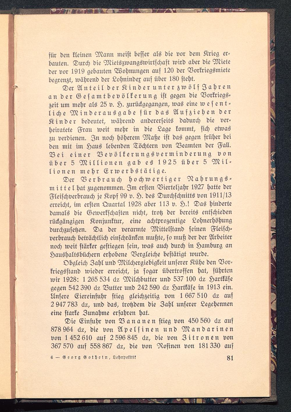 Der Verbrauch hochwertiger Nahrungs-mitte l hat zugenommen. Im ersten Vierteljahr 1927 hatte derFleischverbrauch je Kopf 99 v. H. des Durchschnitts von 1911/13erreicht, im ersten Quartal 1928 aber 113 v. H.! Das hindertedamals die Gewerkschaften nicht, trotz der bereits entschiedenrückgängigen Konjunktur, eine achtprozentige Lohnerhöhungdurchzusehen. Da der verarmte Mittelstand seinen Fleisch-verbrauch beträchtlich einschränken mußte, so muß der der Arbeiternoch weit stärker gestiegen sein, was auch durch in Hamburg anHaushaltsbüchern erhobene Vergleiche bestätigt wurde.