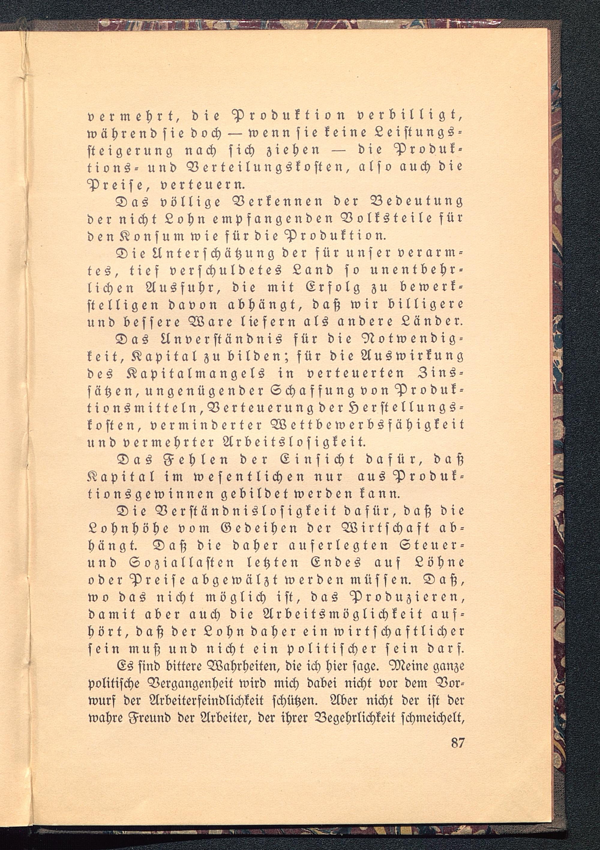 Es sind bittere Wahrheiten, die ich hier sage. Meine ganzepolitische Vergangenheit wird mich dabei nicht vor dem Vor-wurf der Arbeiterfeindlichkeit schützen. Aber nicht der ist derwahre Freund der Arbeiter, der ihrer Begehrlichkeit schmeichelt,