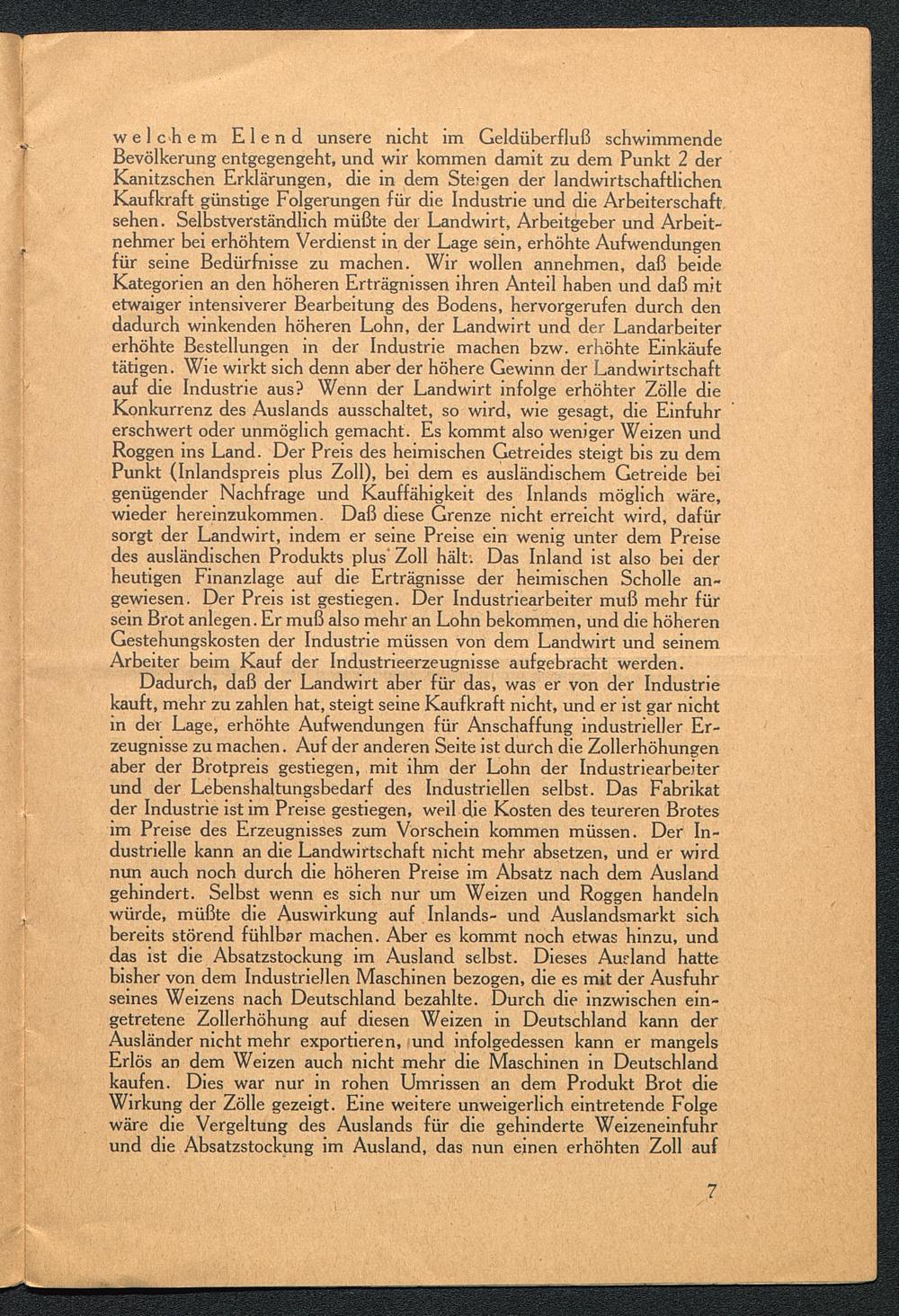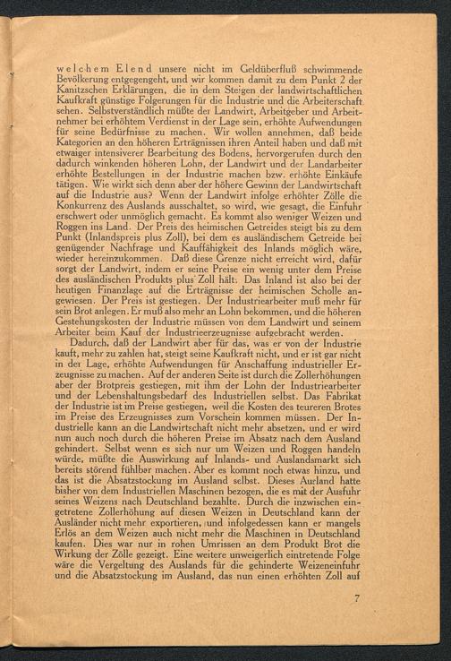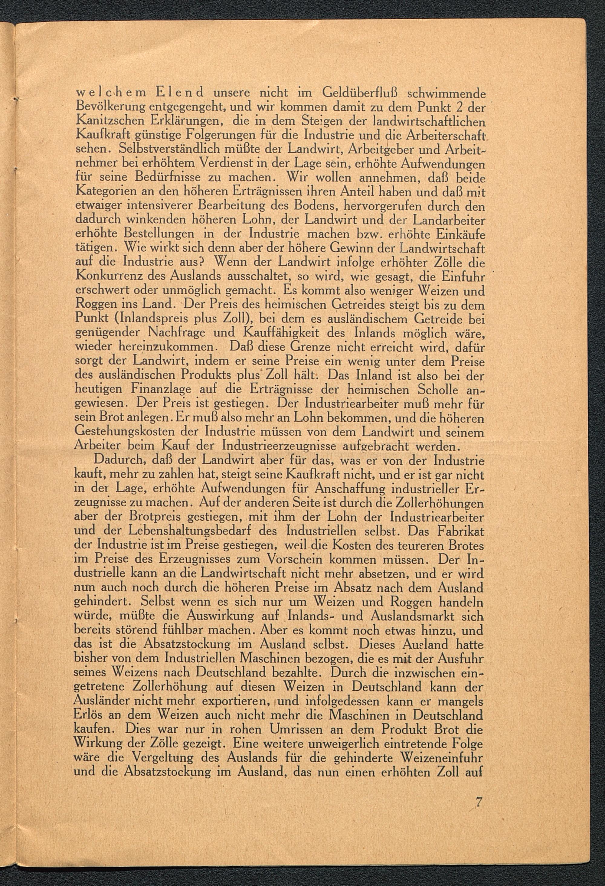 Dadurch, daß der Landwirt aber für das, was er von der Industriekauft, mehr zu zahlen hat, steigt seine Kaufkraft nicht, und er ist gar nichtin der Lage, erhöhte Aufwendungen für Anschaffung industrieller Er-zeugnisse zu machen. Auf der anderen Seite ist durch die Zollerhöhungenaber der Brotpreis gestiegen, mit ihm der Lohn der Industriearbeiterund der Lebenshaltungsbedarf des Industriellen selbst. Das Fabrikatder Industrie ist im Preise gestiegen, weil die Kosten des teureren Brotesim Preise des Erzeugnisses zum Vorschein kommen müssen. Der In-dustrielle kann an die Landwirtschaft nicht mehr absetzen, und er wirdnun auch noch durch die höheren Preise im Absatz nach dem Auslandgehindert. Selbst wenn es sich nur um Weizen und Roggen handelnwürde, müßte die Auswirkung auf Inlands- und Auslandsmarkt sichbereits störend fühlbar machen. Aber es kommt noch etwas hinzu, unddas ist die Absatzstockung im Ausland selbst. Dieses Ausland hattebisher von dem Industriellen Maschinen bezogen, die es mit der Ausfuhrseines Weizens nach Deutschland bezahlte. Durch die inzwischen ein-getretene Zollerhöhung auf diesen Weizen in Deutschland kann derAusländer nicht mehr exportieren, und infolgedessen kann er mangelsErlös an dem Weizen auch nicht mehr die Maschinen in Deutschland kaufen. Dies war nur m rohen Umrissen an dem Produkt Brot dieWirkung der Zölle gezeigt. Eine weitere unweigerlich eintretende Folgewäre die Vergeltung des Auslands für die gehinderte Weizeneinfuhrund die Absatzstockung im Ausland, das nun einen erhöhten Zoll auf