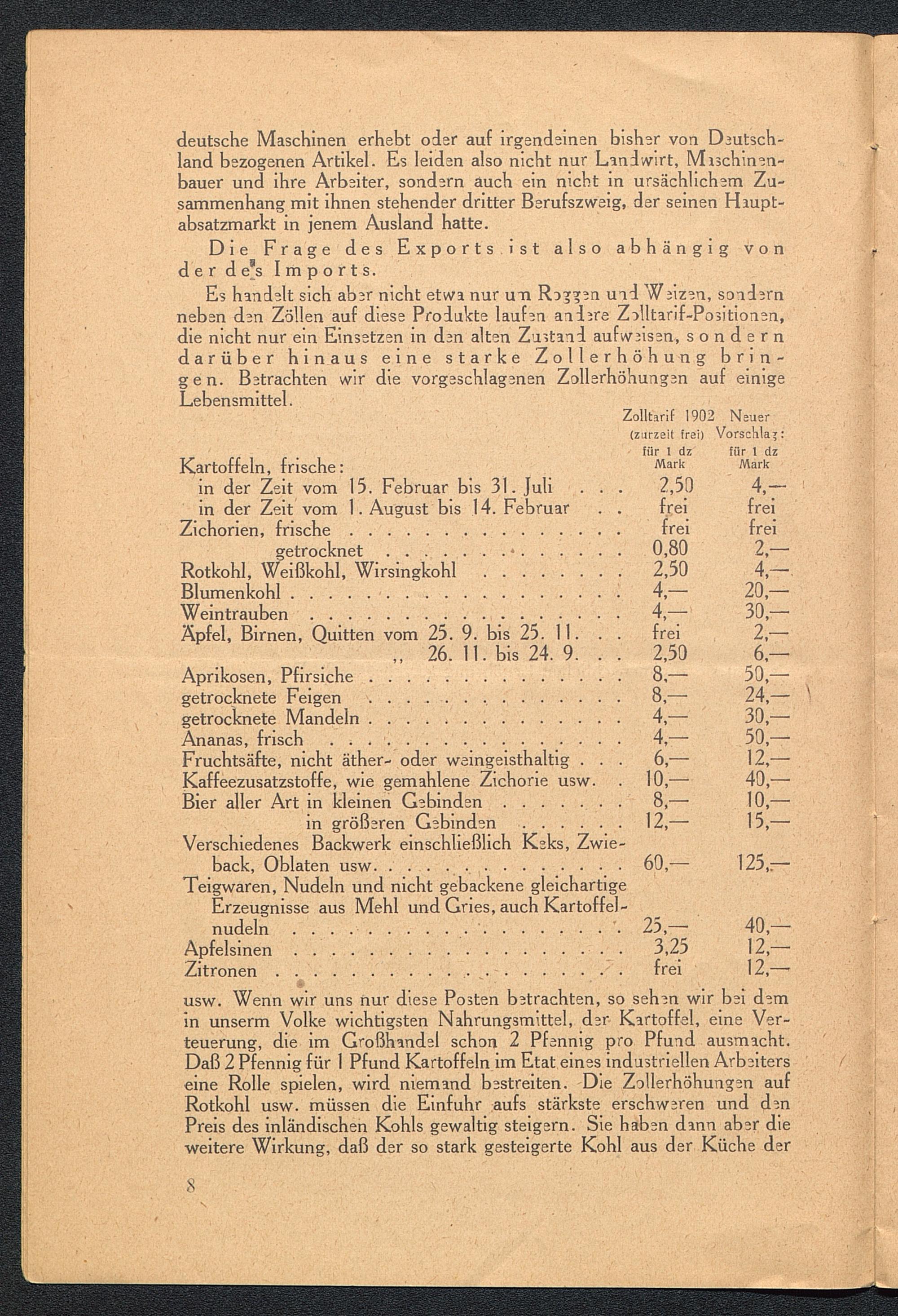usw. Wenn wir uns nur diese Posten betrachten, so sehen wir bei demin unserm Volke wichtigsten Nahrungsmittel, der Kartoffel, eine Ver-teuerung, die im Großhandel schon 2 Pfennig pro Pfund ausmacht.Daß 2 Pfennig für 1 Pfund Kartoffeln im Etat eines industriellen Arbeiterseine Rolle spielen, wird niemand bestreiten. Die Zollerhöhungen aufRotkohl usw. müssen die Einfuhr aufs stärkste erschweren und denPreis des inländischen Kohls gewaltig steigern. Sie haben dann aber dieweitere Wirkung, daß der so stark gesteigerte Kohl aus der Küche der