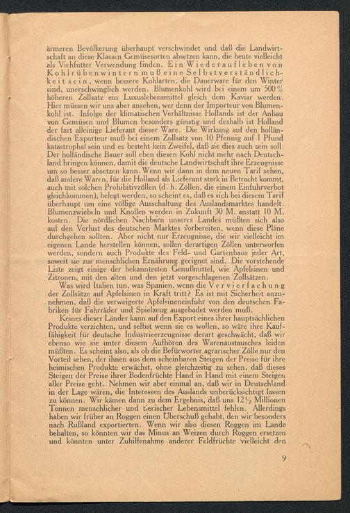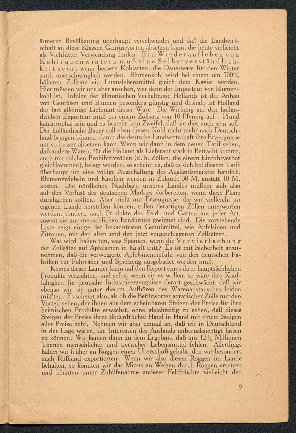 ärmeren Bevölkerung überhaupt verschwindet und daß die Landwirt-schaft an diese Klassen Gemüsesorten absetzen kann, die heute vielleichtals Viehfütter Verwendung finden. Ein Wieder aufleben vonKohlrübenwintern muß eine Selbstverständlich-keit sein , wenn bessere Kohlarten, die Dauerware für den Wintersind, unerschwinglich werden. Blumenkohl wird bei einem um 500%höheren Zollsatz ein Luxuslebensmittel gleich dem Kaviar werden.Hier müssen wir uns aber ansehen, wer denn der Importeur von Blumen-kohl ist. Infolge der klimatischen Verhältnisse Hollands ist der Anbauvon Gemüsen und Blumen besonders günstig und deshalb ist Holland der fast alleinige Lieferant dieser Ware. Die Wirkung auf den hollän-dischen Exporteur muß bei einem Zollsatz von 10 Pfennig auf 1 Pfundkatastrophal sein und es besteht kein Zweifel, daß sie dies auch sein soll.Der holländische Bauer soll eben diesen Kohl nicht mehr nach Deutsch-land bringen können, damit die deutsche Landwirtschaft ihre Erzeugnisseum so besser absetzen kann. Wenn wir dann in dem neuen Tarif sehen,daß andere Waren, für die Holland als Lieferant stark in Betracht kommt,auch mit solchen Prohibitivzöllen (d. h. Zöllen, die einem Einfuhrverbotgleichkommen), belegt werden, so scheint es, daß es sich bei diesem Tarifüberhaupt um eine völlige Ausschaltung des Auslandsmarktes handelt.Blumenzwiebeln und Knollen werden in Zukunft 30 M. anstatt 10 M.kosten. Die nördlichen Nachbarn unseres Landes müßten sich alsoauf den Verlust des deutschen Marktes vorbereiten, wenn diese Plänedurchgehen sollten. Aber nicht nur Erzeugnisse, die wir vielleicht imeigenen Lande hersteilen können, sollen derartigen Zöllen unterworfenwerden, sondern auch Produkte des Feld- und Gartenbaus jeder Art,soweit sie zur menschlichen Ernährung geeignet sind. Die vorstehendeListe zeigt einige ■ der bekanntesten Genußmittel, wie Apfelsinen undZitronen, mit den alten und den jetzt vorgeschlagenen Zollsätzen.