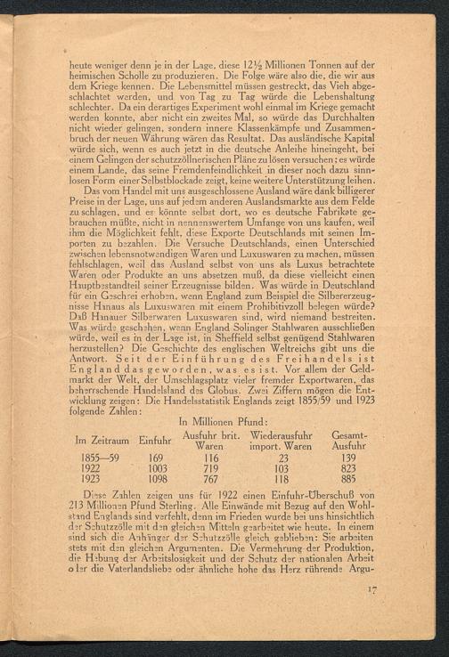 Diese Zahlen zeigen uns für 1922 einen Einfuhr-Uberschuß von213 Million en Pfund Sterling. Alle Einwände mit Bezug auf den Wohl-stand Englands sind verfehlt, denn im Frieden wurde bei uns hinsichtlichder Schutzzölle mit den gleichen Mitteln gearbeitet wie heute. In einemsind sich die Anhänger der Schutzzölle gleich geblieben: Sie arbeitenstets mit den gleichen Argumenten. Die Vermehrung der Produktion,die Hebung der Arbeitslosigkeit und der Schutz der nationalen Arbeitoier die Vaterlandsliebe oder ähnliche hohe das Herz rührende Argu-