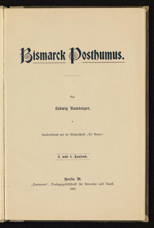 Mmarck Postkumus.VonLudwig Bamberger .Sondcrabdruck aus der Wochenschrift „Die Nation"3. und 4. Tausend.Merlin W.„Harmonie", Verlagsgesellschaft für Literatur und Runst,13S9.