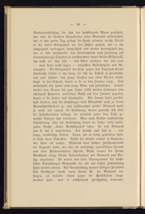 Vertrauensstellung, die ihm der hochstehende Mann gewährte,hat uns die kleinsten Einzelheiten jedes Moments aufbewahrt;wie er ihm guten Tag gesagt, die Hand geboten, welche Stiefeler bei dieser Gelegenheit an den Füßen gehabt, wie er ihnausgezankt, verleugnet, fortgeschickt und wieder hereingeholt hat;wie er ihm vorschreibt, von Friedrichsruh nach Hamburg aufvierundzwanzig Stunden zu verschwinden, damit Kaiser WilhelmII.ihn nicht bei ihm sehe — das Alles erfahren wir mit einer— man kann wohl sagen — entzückten Ausrichtigkeit und Ge-nauigkeit. Bei Gelegenheit der Hetze gegen das Tagebuch KaiserFriedrichs behält er ihu lange bei sich im Schloß zu Friedrichs-ruh und schüttet ihm ganze Truhen von alten Briefen blind-lings in den Schooß, damit er sie in sein Zimmer trage. Daswiederholt sich später noch einige Male, und gründlicher. Immerwieder von Neuem bis zum Jahre 1892 werden Ladungen vonallerhand Papieren unbesehen Busch auf sein Zimmer gegeben,damit er sie sortire und katalogisire. Wie konnte dabei zweifel-haft bleiben, daß der Empfänger diese Aktenstücke auch zu seinerPrivatschriftstellerei ge- und mißbrauchen werde! Bismarck hatteja mehr als einmal die Ersahrung davon gemacht, sich überdie Indiskretionen beklagt, die heimlich unter dem Tisch ge-machte Notizen ihm bereiteten. Man muß Bnschs ausführlicheSchilderung über die Entstehung seines im Jahre 1884 Pubii-zirten Buchs „Unser Reichskanzler" lesen. Er ließ Bismarckvon A bis Z mitarbeiten. Der streicht und setzt zu — einelange, weitläufige Arbeit. Tann, als es fertig geworden, hatteer doch einen Schrecken. Busch fiel wieder einmal in Ungnade,wie schon oft vorher. Während einer solchen Zwischenperiodeder Ungnade hatte, wie mir ein unbedingt zuverlässiger Freundund alter Parlamentarier schreibt, Busch einmal der FirmaBrockhaus einige Bände Unterredungen mit Bismarck zum Ver-lag angeboten. Es waren das seine Stenogramme der nächt-lichen Auslassungen Bismarcks, die alle mit dessen Zustimmungfixirt worden waren. Auf Veranlassung meines selbigen Freundesließ Brockhaus durch einen Herrn W. bei Bismarck an-fragen, ob derselbe etwas gegen die Publikation einzu-wenden habe, was er anscheinend gleichgültig verneinte.