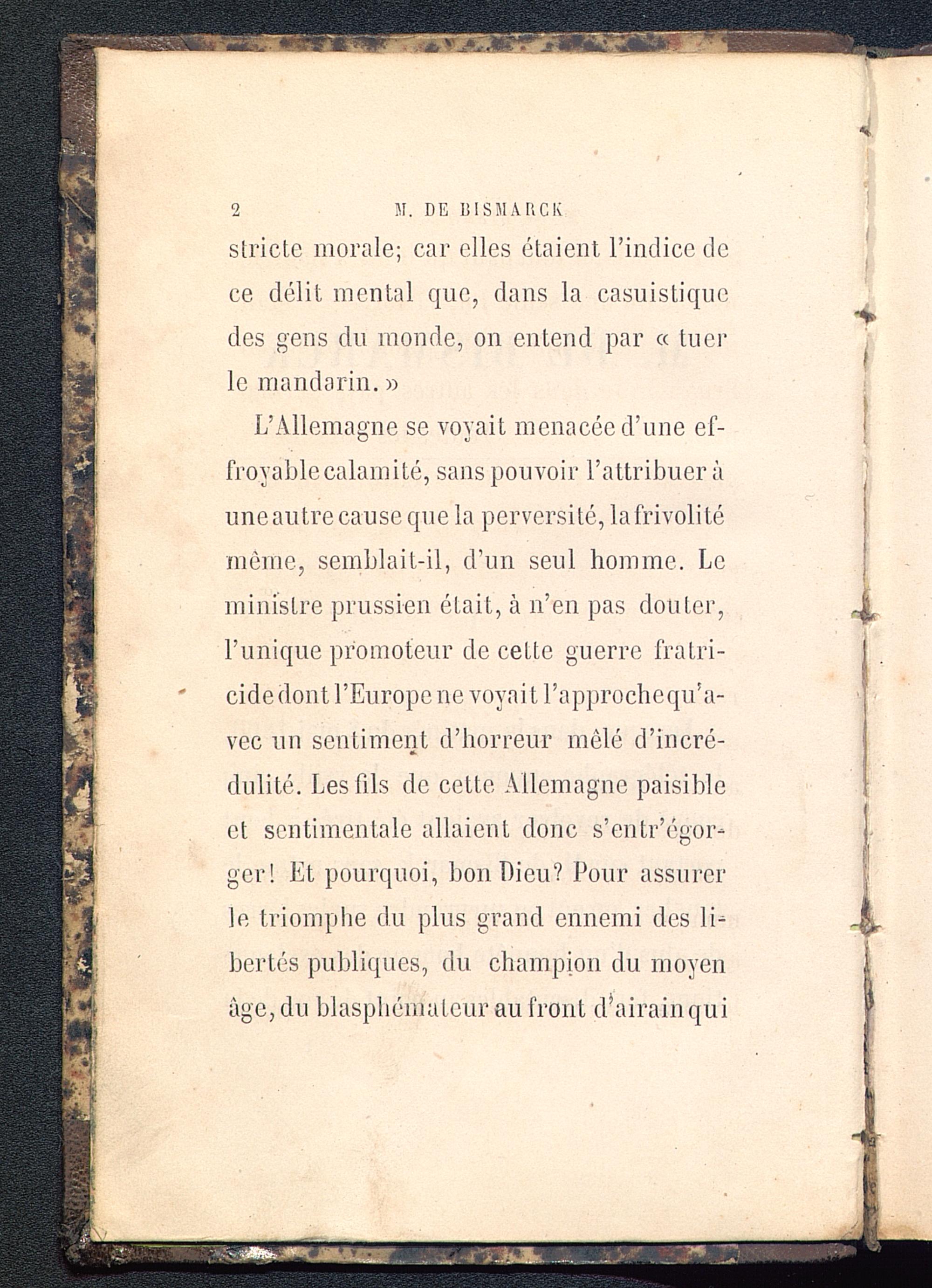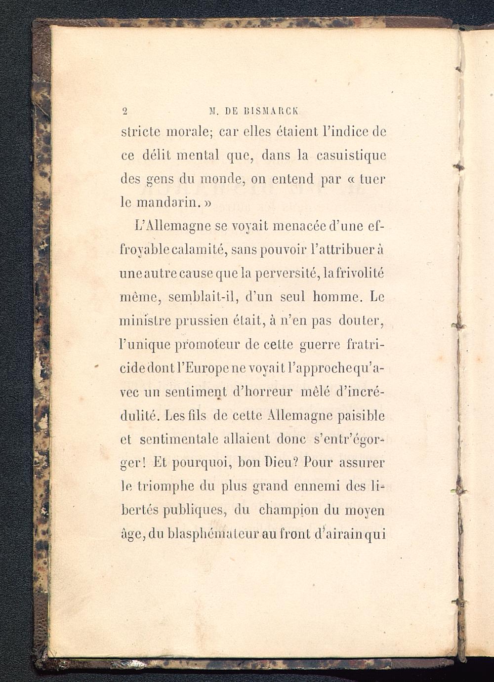 L’Allemagne se voyait menacée d’une ef-froyable calamité, sans pouvoir l’attribuer àuneautrecause que la perversité, lafrivolitémême, semblait-il, d’un seul homme. Leministre prussien était, à n’en pas douter,l’unique promoteur de cette guerre fratri-cide dont l’Europe ne voyait l’approchequ’a-vec un sentiment d’horreur mêlé d’incré-dulité. Les fils de cette Allemagne paisibleet sentimentale allaient donc s’entr’égor-ger! Et pourquoi, bon Dieu ? Pour assurerle triomphe du plus grand ennemi des li-bertés publiques, du champion du moyenâge, du blasphémateur au front d i airainqui