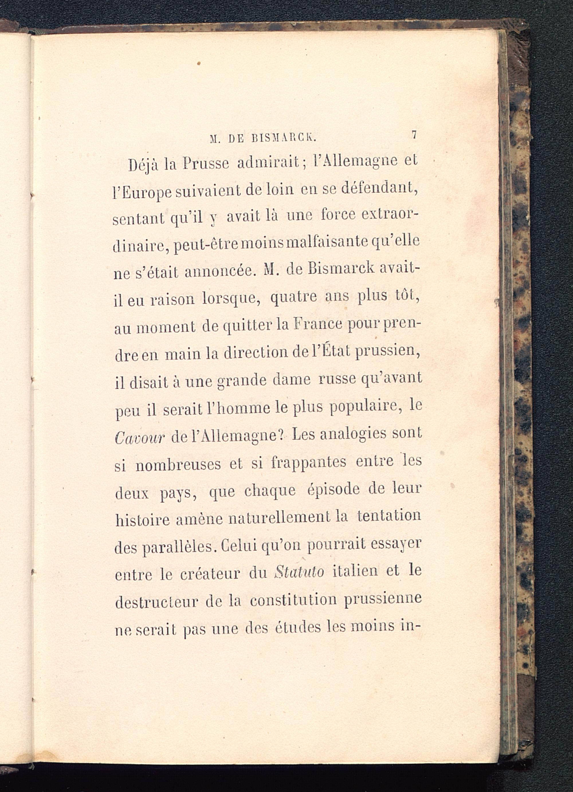 Déjà la Prusse admirait; l’Allemagne etl’Europe suivaient de loin en se défendant,sentant qu’il y avait là une force extraor-dinaire, peut-être moins malfaisante qu’ellene s’était annoncée. iM. de Bismarck avait-il eu raison lorsque, quatre ans plus tôt,au moment de quitter la France pour pren-dre en main la direction de l’État prussien ,il disait à une grande dame russe qu’avantpeu il serait l’homme le plus populaire, leCacour de l’Allemagne? Les analogies sontsi nombreuses et si frappantes entre lesdeux pays, que chaque épisode de leurhistoire amène naturellement la tentationdes parallèles. Celui qu’on pourrait essayerentre le créateur du Statuto italien et ledestructeur de la constitution prussienne ne serait pas une des études les moins in-