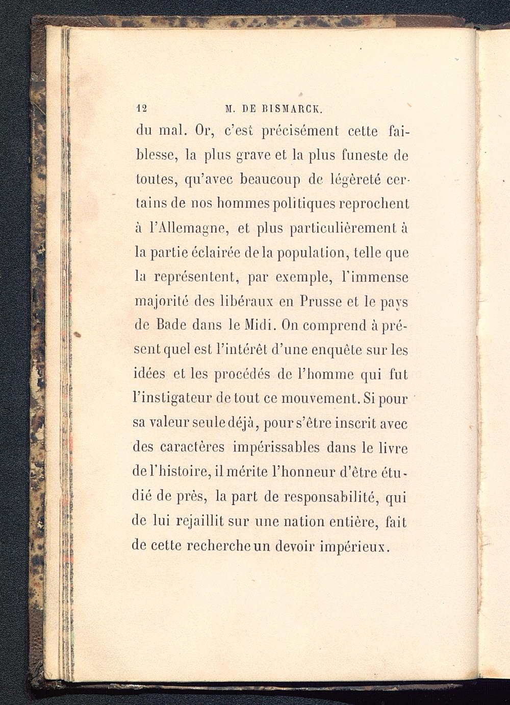 du mal. Or, c’est précisément cette fai-blesse, la plus grave et la plus funeste detoutes, qu’avec beaucoup de légèreté cer-tains de nos hommes poli tiques reprochentà l’Allemagne , et plus particulièrement àla partie éclairée de la population, telle quela représentent, par exemple, l’immensemajorité des libéraux en Prusse et le paysde Bade dans le Midi. On comprend à pré-sent quel est l’intérêt d’une enquête sur lesidées et les procédés de l’homme qui futl’instigateur de tout ce mouvement. Si poursa valeur seule déjà, pour s’être inscrit avecdes caractères impérissables dans le livrede l’histoire, il mérite l’honneur d’être étu-dié de près, la part de responsabilité, quide lui rejaillit sur une nation entière, faitde cette recherche un devoir impérieux.