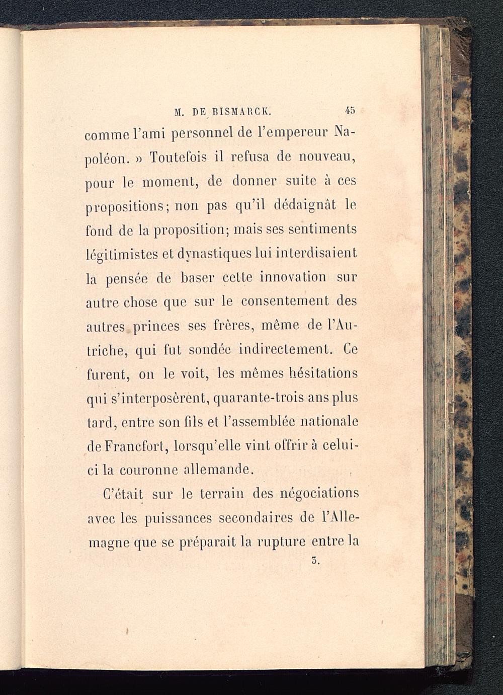 comme l’ami personnel de l’empereur Na-poléon. » Toutefois il refusa de nouveau,pour le moment, de donner suite à cespropositions; non pas qu’il dédaignât lefond de la proposition; mais ses sentimentslégitimistes et dynastiques lui interdisaientla pensée de baser celte innovation surautre chose que sur le consentement desautres princes ses frères, même de l’Au-triche , qui fut sondée indirectement. Cefurent, on le voit, les mêmes hésitationsqui s’interposèrent, quarante-trois ans plustard, entre son fils et l’assemblée nationalede Francfort , lorsqu’elle vint offrira celui-ci la couronne allemande .