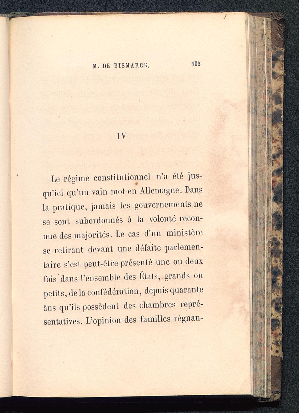Le régime constitutionnel n’a été jus-qu’ici qu’un vain mot en Allemagne . Dansla pratique, jamais les gouvernements nese sont subordonnés à la volonté recon-nue des majorités. Le cas d’un ministèrese retirant devant une défaite parlemen-taire s’est peut-être présenté une ou deuxfois dans l’ensemble des Etats, grands oupetits, delà confédération, depuis quaranteans qu’ils possèdent des chambres repré-sentatives. L’opinion des familles régnan-