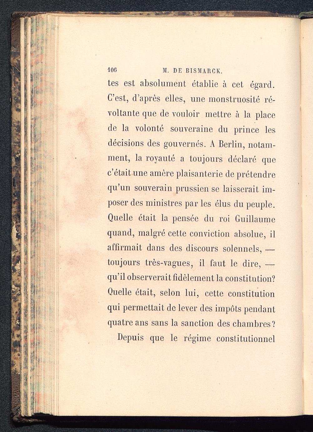tes est absolument établie à cet égard.C’est, d’après elles, une monstruosité ré-voltante que de vouloir mettre à la placede la volonté souveraine du prince lesdécisions des gouvernés. A Berlin, notam-ment, la royauté a toujours déclaré quec’était une amère plaisanterie de prétendrequ’un souverain prussien se laisserait im-poser des ministres par les élus du peuple.Quelle était la pensée du roi Guillaumequand, malgré cette conviction absolue, ilaffirmait dans des discours solennels, —toujours très-vagues, il faut le dire, —qu’il observerait fidèlement la constitution?Quelle était, selon lui, cette constitutionqui permettait de lever des impôts pendantquatre ans sans la sanction des chambres?