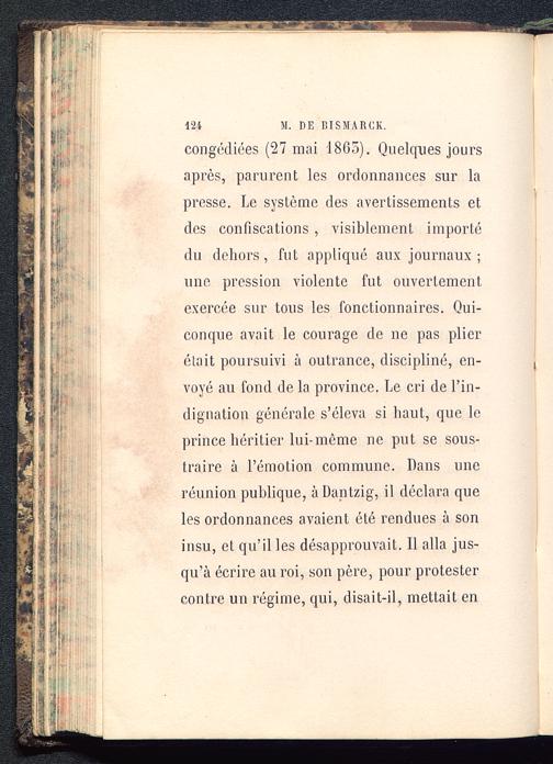congédiées (27 mai 1865). Quelques joursaprès, parurent les ordonnances sur lapresse. Le système des avertissements etdes confiscations , visiblement importédu dehors, fut appliqué aux journaux;une pression violente fut ouvertementexercée sur tous les fonctionnaires. Qui-conque avait le courage de ne pas plierétait poursuivi à outrance, discipliné, en-voyé au fond de la province. Le cri de l’in-dignation générale s’éleva si haut, que leprince héritier lui-même ne put se sous-traire à l’émotion commune. Dans uneréunion publique, à Dantzig, il déclara queles ordonnances avaient été rendues à soninsu, et qu’il les désapprouvait. Il alla jus-qu’à écrire au roi, son père, pour protestercontre un régime, qui, disait-il, mettait en