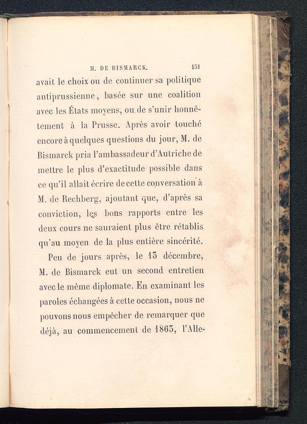 avait le choix ou de continuel' sa politiqueautipi'ussienne, basée sur une coalitionavec les États moyens, ou.de s’unir honnê-tement à la Prusse . Après avoir touchéencore à quelques questions du jour, M. deBismarck pria l’ambassadeur d’Autriche demettre le plus d’exactitude possible dansce qu’il allait écrire decette conversation àM. de Rechberg, ajoutant que, d’après saconviction, lçs bons rapports entre lesdeux cours ne sauraient plus être rétablisqu’au moyen de la plus entière sincérité.