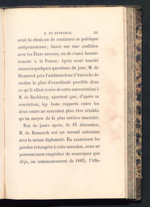 Peu de jours après, le 15 décembre,M. de Bismarck eut un second entretienavec le môme diplomate. En examinant lesparoles échangées à cette occasion, nous nepouvons nous empêcher de remarquer quedéjà, au commencement de 1865, l’Aile-