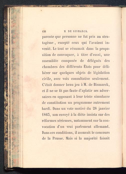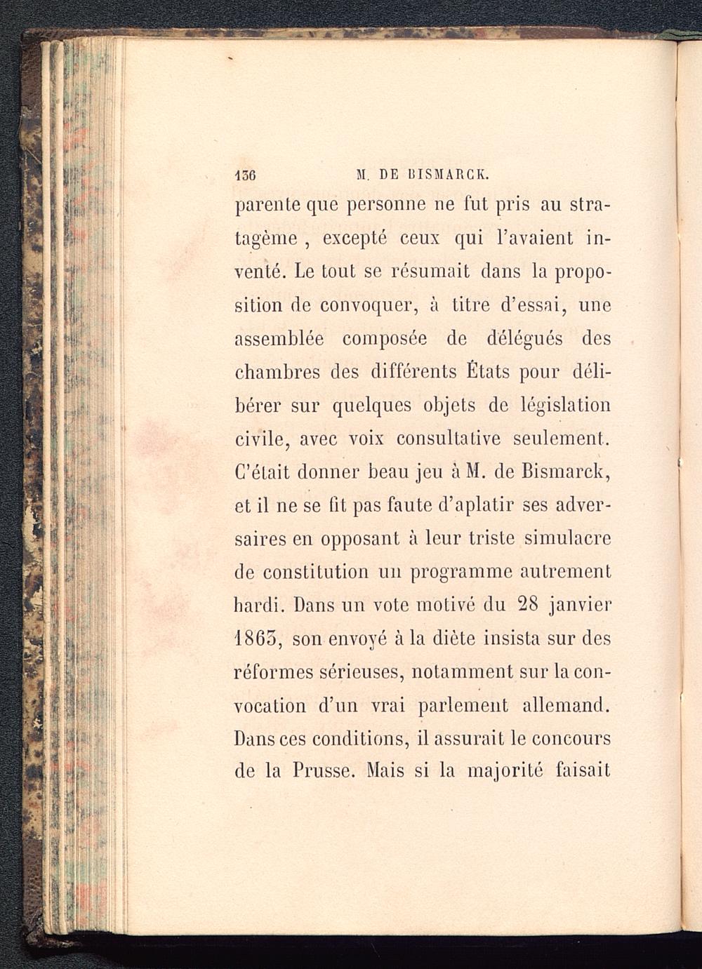 parente que personne ne fut pris au stra-tagème , excepté ceux qui l’avaient in-venté. Le tout se résumait dans la propo-sition de convoquer, à titre d’essai, uneassemblée composée de délégués deschambres des différents États pour déli-bérer sur quelques objets de législationcivile, avec voix consultative seulement.C’était donner beau jeu à M. de Bismarck,et il ue se lit pas faute d’aplatir ses adver-saires en opposant à leur triste simulacrede constitution un programme autrementhardi. Dans un vote motivé du 28 janvier1865, son envoyé à la diète insista sur desréformes sérieuses, notamment sur la con-vocation d’un vrai parlement allemand. Dans ces conditions, il assurait le concoursde la Prusse. Mais si la majorité faisait